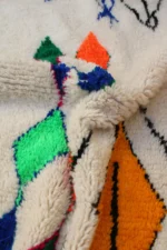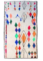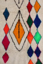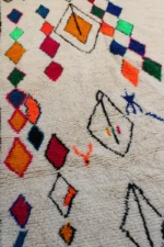 A brilliant cascade of jewel-toned diamonds forms the vibrant heart of this Azilal rug. Set against a soft, natural wool base, a central path of ruby red, emerald green, and sapphire blue creates a stunning visual journey from end to end. Around this core, other free-form symbols and outlined diamonds float with playful energy. This piece is a testament to the weaver’s joyful creativity, a one-of-a-kind work of art that brings pure, uninhibited color and life into the home.