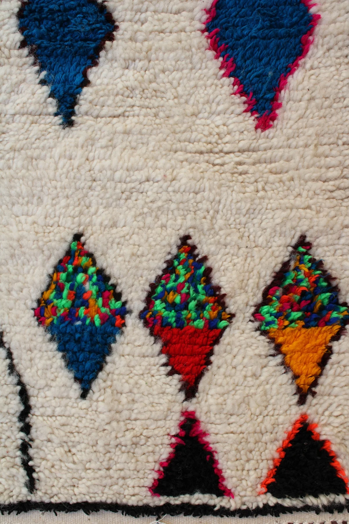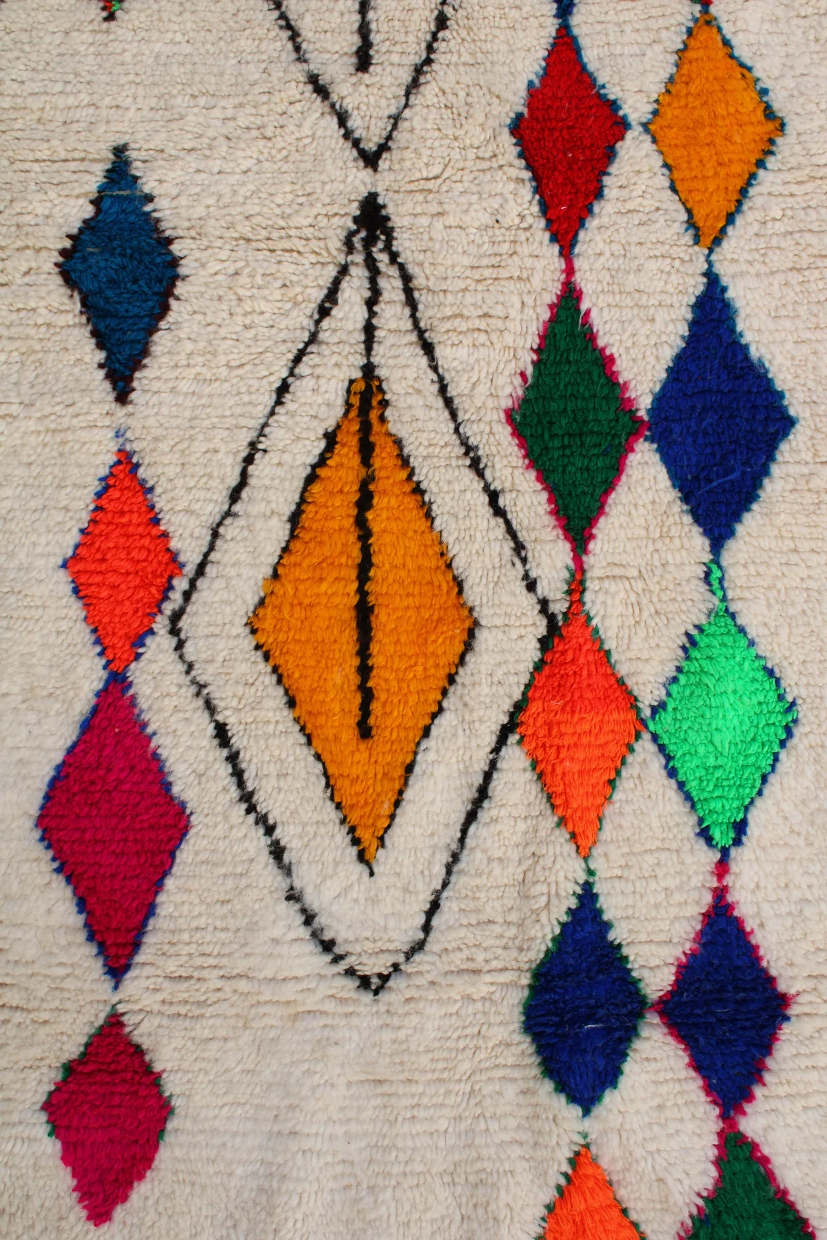 A brilliant cascade of jewel-toned diamonds forms the vibrant heart of this Azilal rug. Set against a soft, natural wool base, a central path of ruby red, emerald green, and sapphire blue creates a stunning visual journey from end to end. Around this core, other free-form symbols and outlined diamonds float with playful energy. This piece is a testament to the weaver’s joyful creativity, a one-of-a-kind work of art that brings pure, uninhibited color and life into the home.