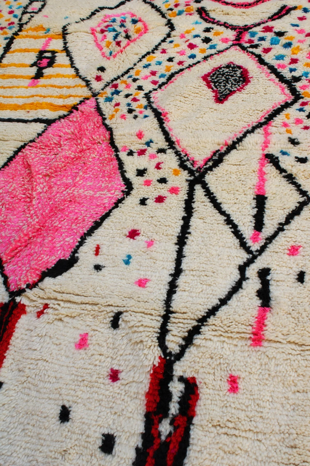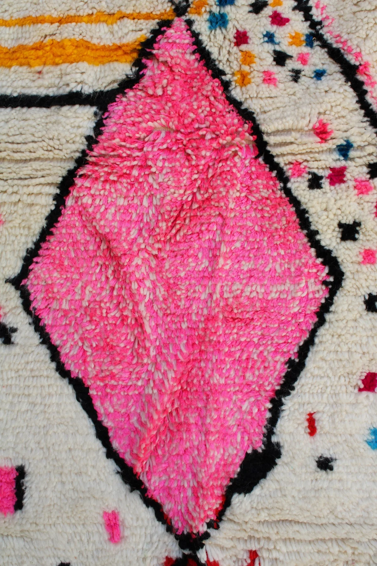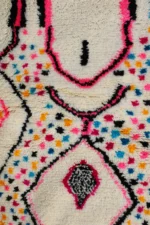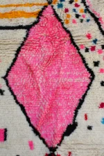 This rug captures the chaotic, joyful energy of a meadow in springtime. Its creamy wool base is sprinkled with a confetti of colorful dots, while bold shapes in vibrant pink bloom with life. Woven with pure intuition, this Azilal piece is a celebration, a free-spirited work of art that brings unrestrained happiness and character to the home. The large, outlined diamonds provide a traditional structure for this modern explosion of color.