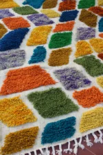 This remarkable rug is a garden of colorful, textured shapes blooming on a flatweave field. This inventive mixed technique, combining a durable base with plush, shaggy islands of color, creates a stunningly tactile experience. Each jewel-toned shapeāemerald green, sapphire blue, and sun-baked orangeāinvites touch and adds a playful, three-dimensional quality to the design. It’s a joyful piece that captures the creative spirit of the Azilal weavers, bringing life and unique texture to any floor.