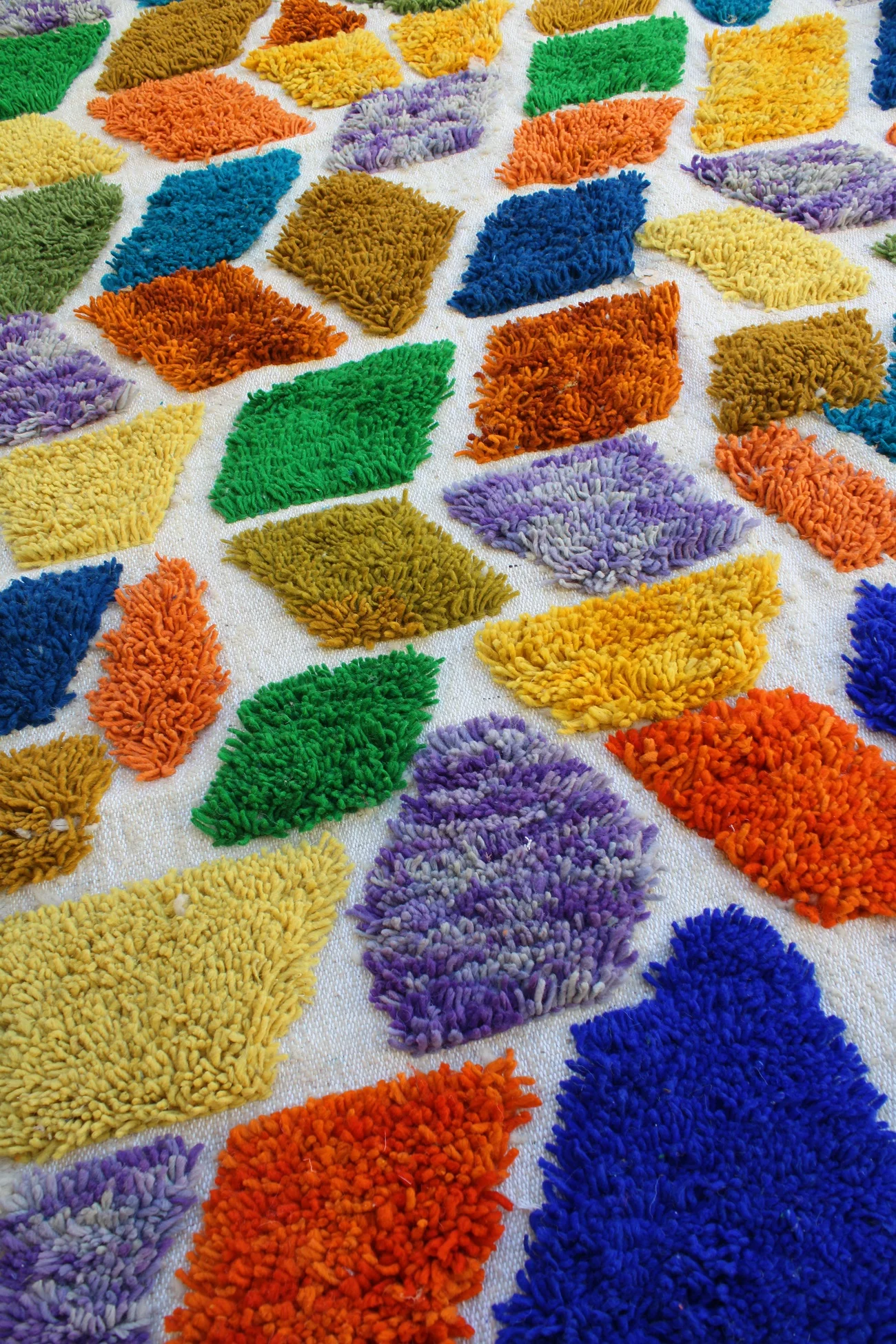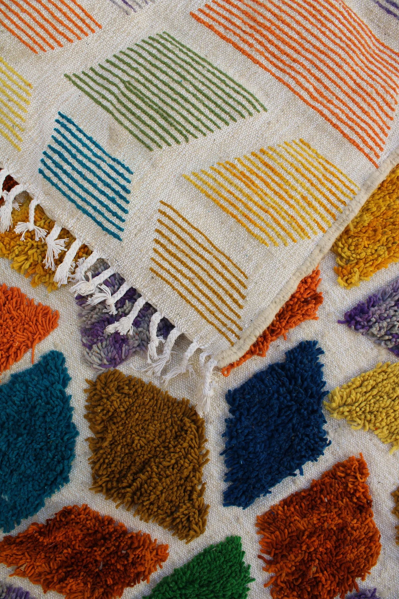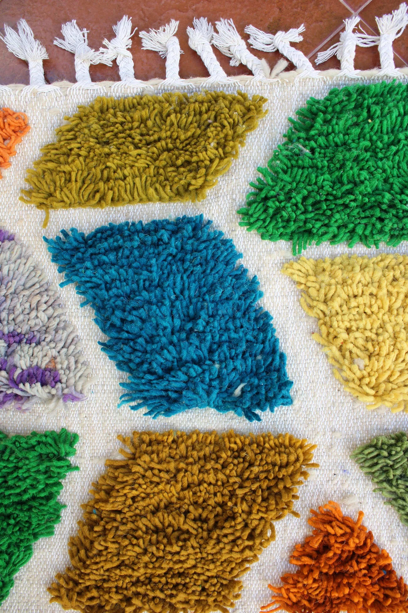 This remarkable rug is a garden of colorful, textured shapes blooming on a flatweave field. This inventive mixed technique, combining a durable base with plush, shaggy islands of color, creates a stunningly tactile experience. Each jewel-toned shapeāemerald green, sapphire blue, and sun-baked orangeāinvites touch and adds a playful, three-dimensional quality to the design. It’s a joyful piece that captures the creative spirit of the Azilal weavers, bringing life and unique texture to any floor.