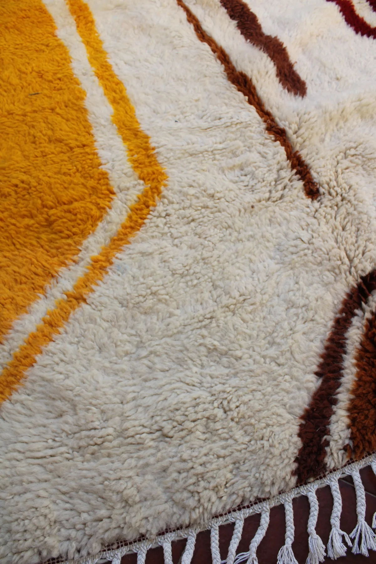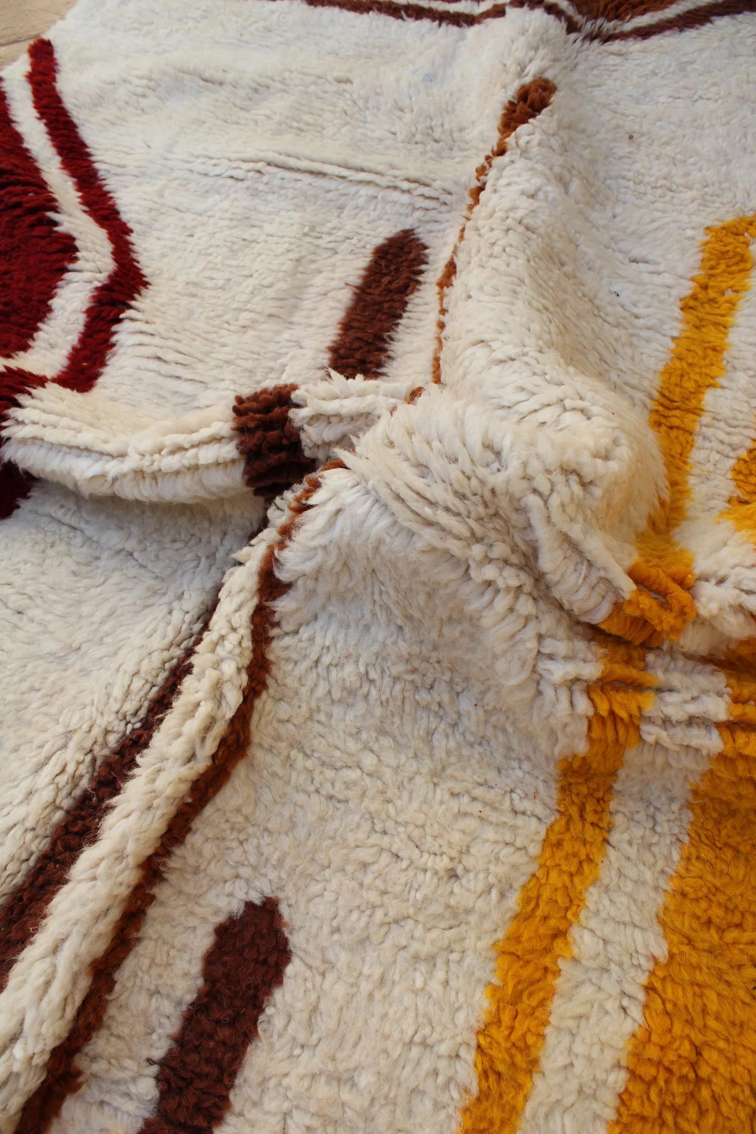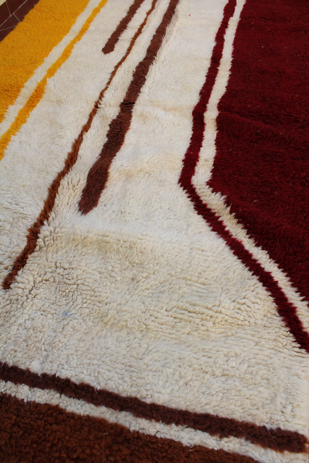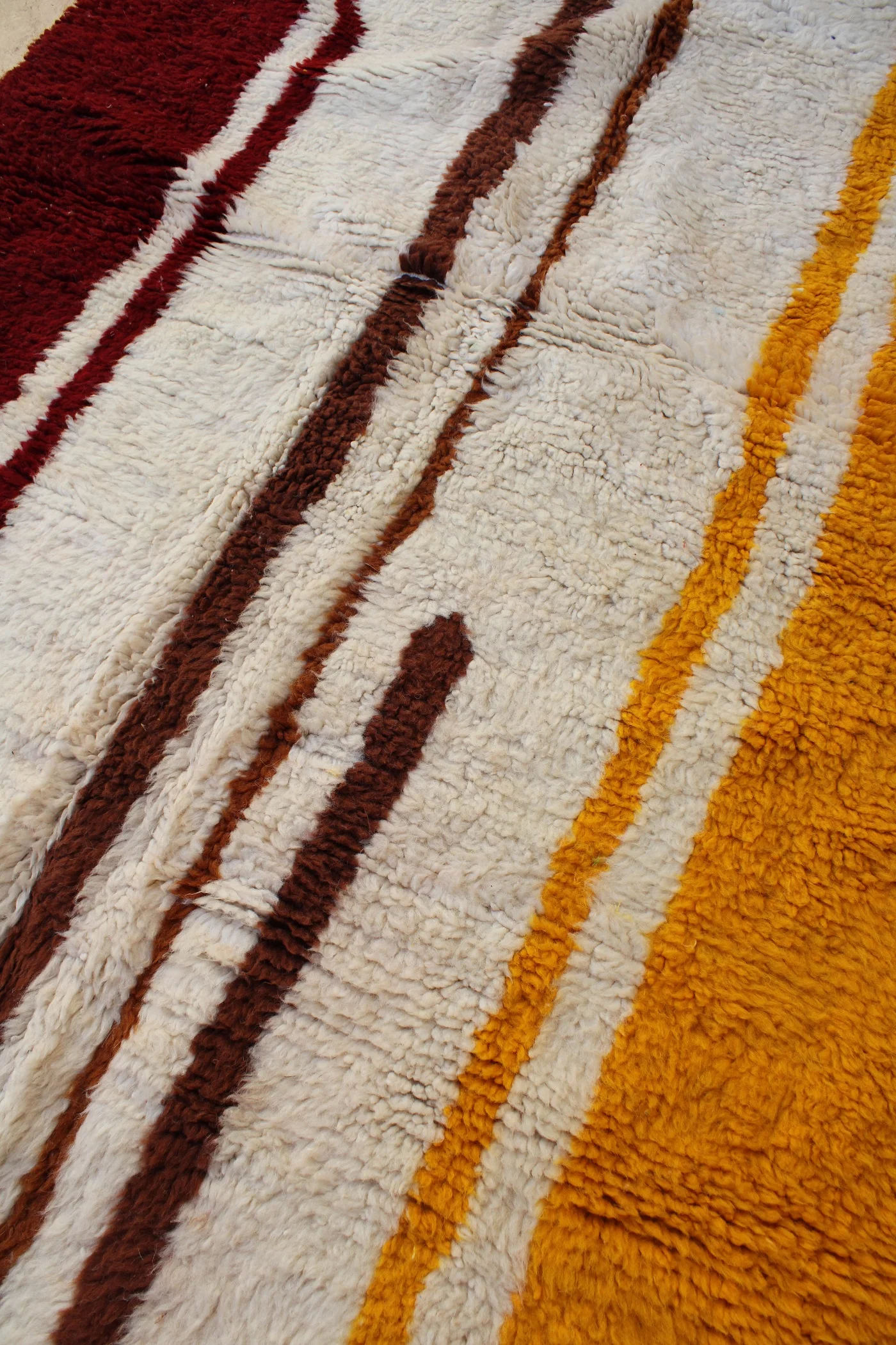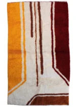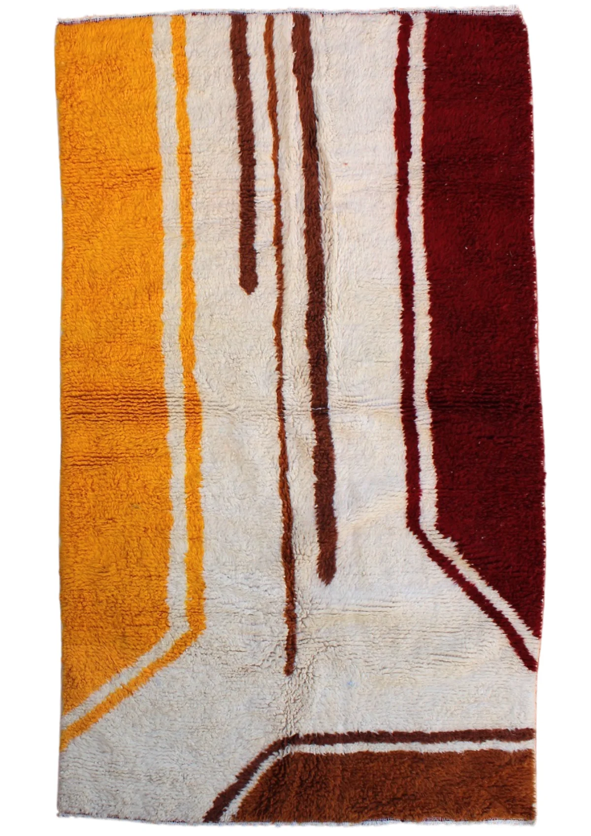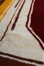 This rug is a powerful, minimalist landscape rendered in plush wool. Bold fields of deep ochre, rich burgundy, and earthy brown are separated by rivers of natural ivory wool, creating a design that feels both grounded and modern. The weaver has used strong, confident lines to build a sense of structure and space. It’s a testament to the idea that simplicity can be profoundly beautiful, a piece that brings warmth, depth, and organic modernism to any room.
