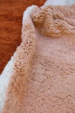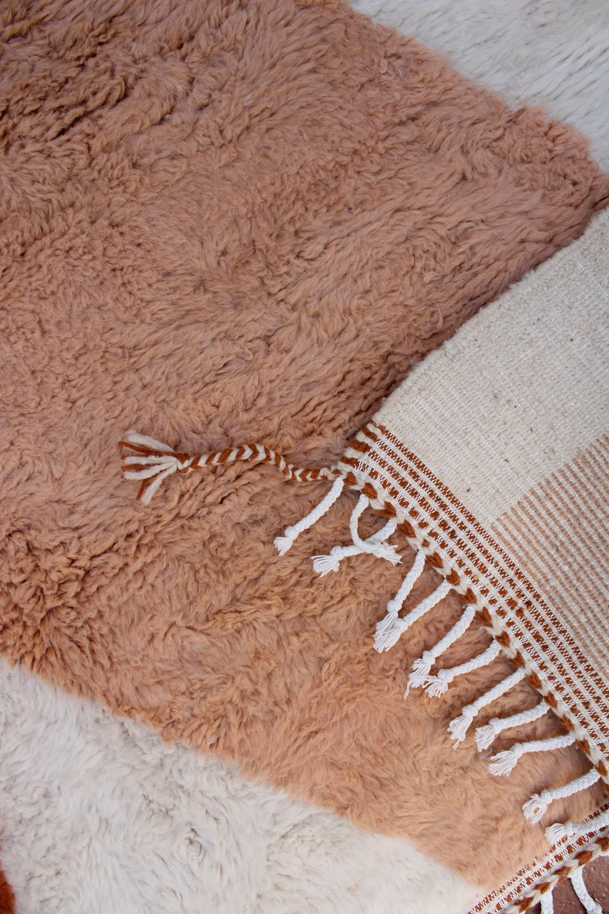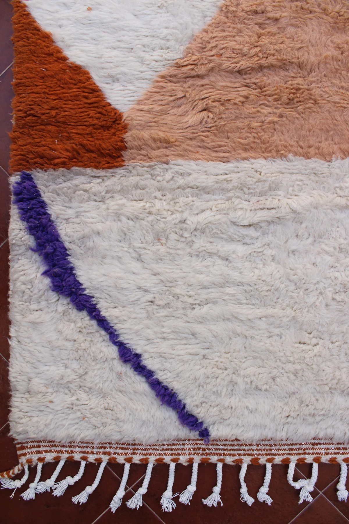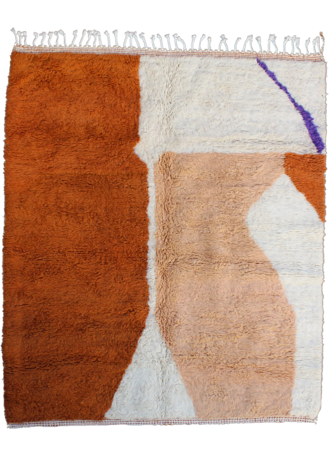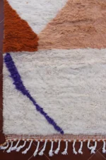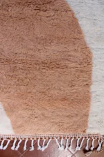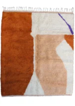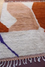 This Beni Ourain rug is a powerful piece of abstract art, where plush wool becomes a canvas for bold, organic forms. Large, flowing shapes in sun-baked terracotta, soft desert peach, and pure ivory define the design, with a delicate whisper of purple adding an unexpected touch. This piece pushes the boundaries of traditional weaving, creating a sculptural, modern statement that retains the comforting, luxurious feel of authentic Beni Ourain craftsmanship. Itās a rug that truly redefines the space it inhabits.