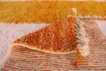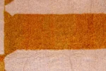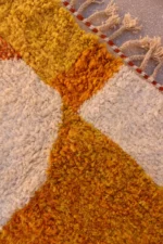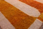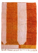 Named ‘Taghzout,’ meaning ‘plateau,’ this Beni Ourain rug is a sprawling, abstract tapestry of color and texture. Dominant fields of sun-baked orange and soft, creamy ivory stretch across its plush surface, creating an expansive, calming effect. Organic lines and shapes in subtle peach and an unexpected hint of purple add an artistic, modern depth. This piece embodies contemporary design while retaining the luxurious comfort and authentic craftsmanship of traditional Beni Ourain weaving.