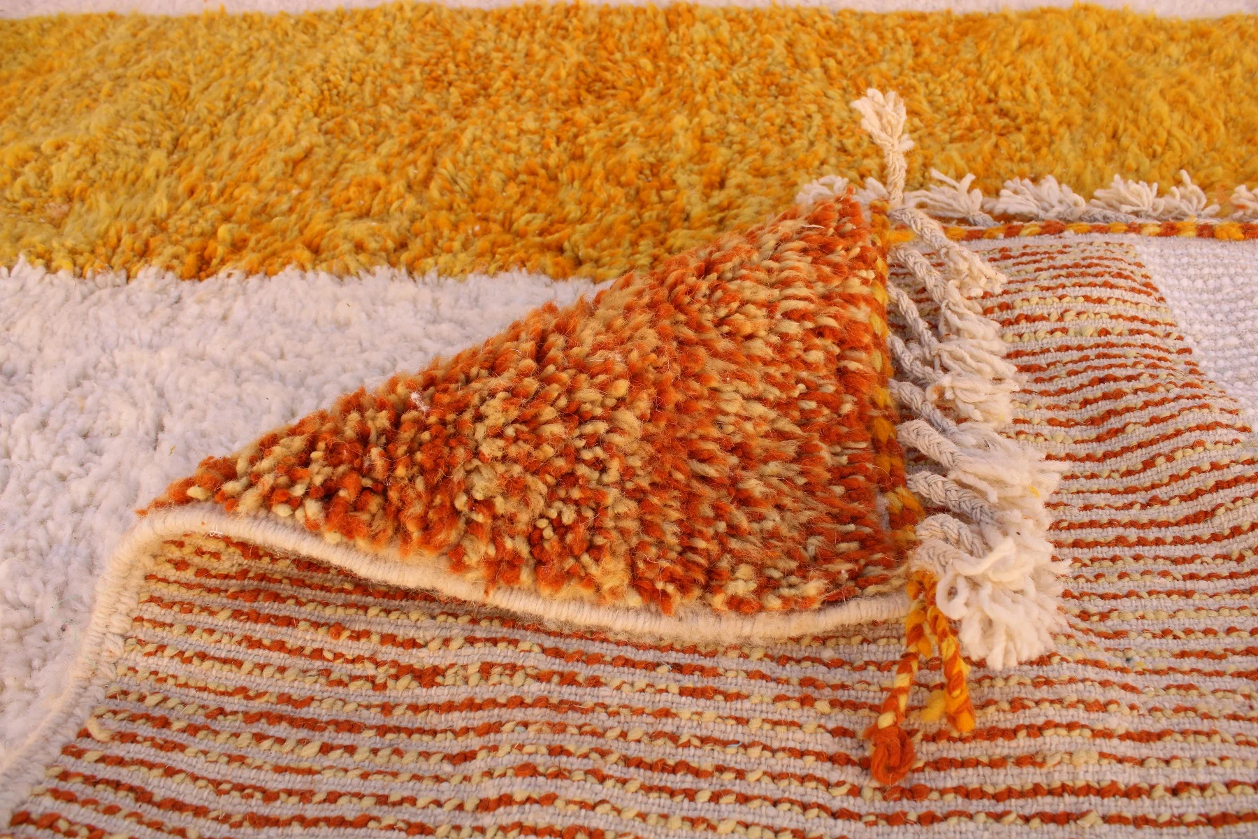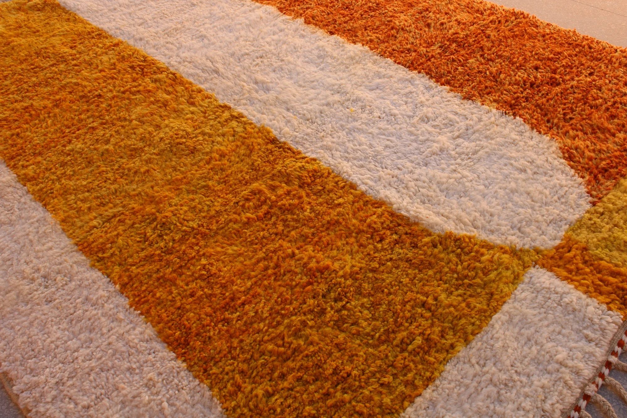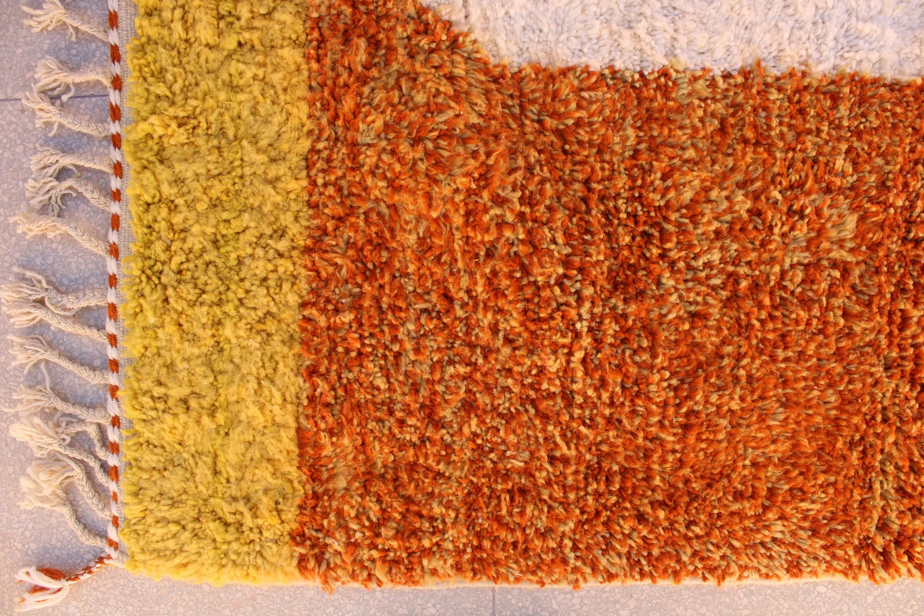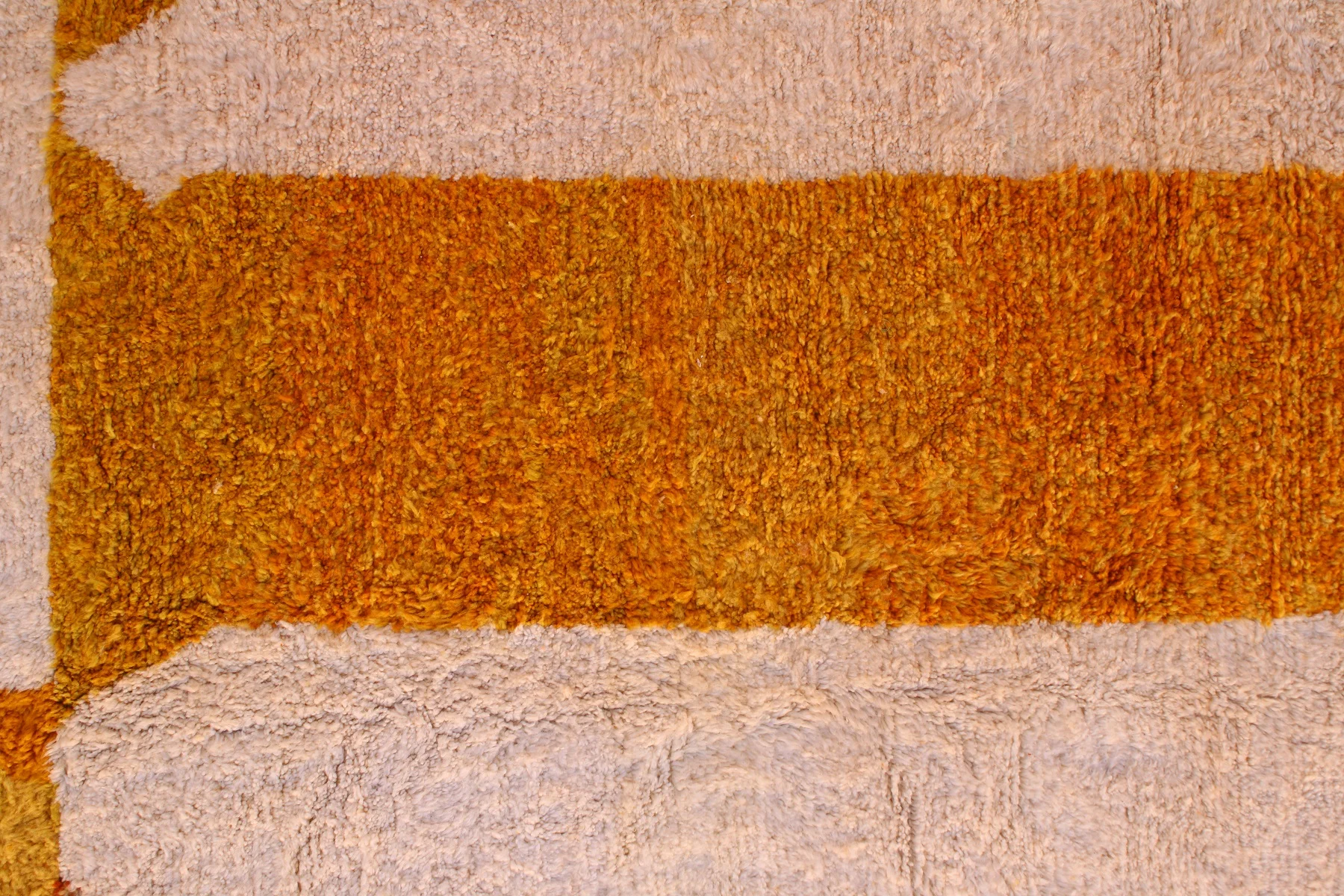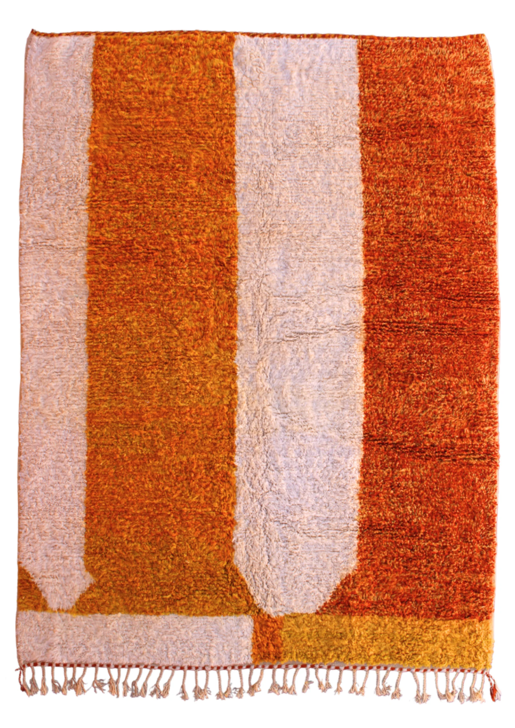 A sprawling abstract tapestry, this Beni Ourain rug uses vast fields of sun-baked orange and creamy ivory to create an expansive, modern, and plush masterpiece.