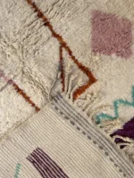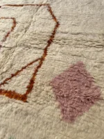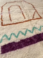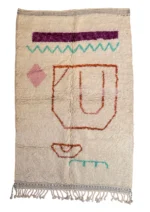 Named ‘Tiqqi,’ meaning ‘expression’ or ‘countenance,’ this Beni Ourain rug is a truly captivating piece of modern folk art. Upon its plush, creamy wool base, bold, simplified shapes in deep purple, rust orange, and soft pink create an abstract visage or figure. A striking turquoise zigzag and a single, expressive eye add a touch of whimsy and unexpected color. This rug pushes the boundaries of traditional Beni Ourain design, offering a unique, artistic statement that is both playful and profoundly original.