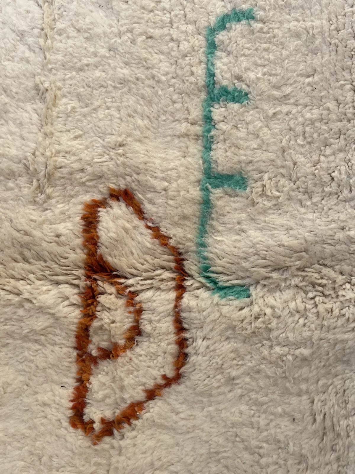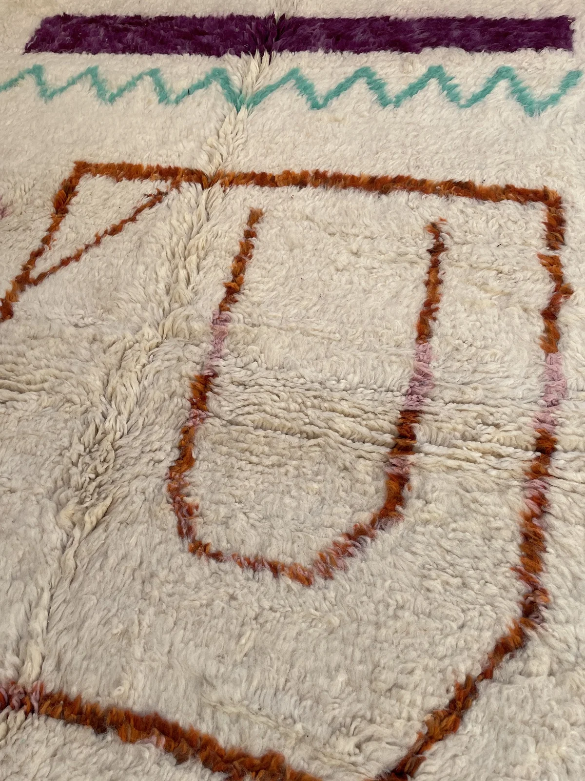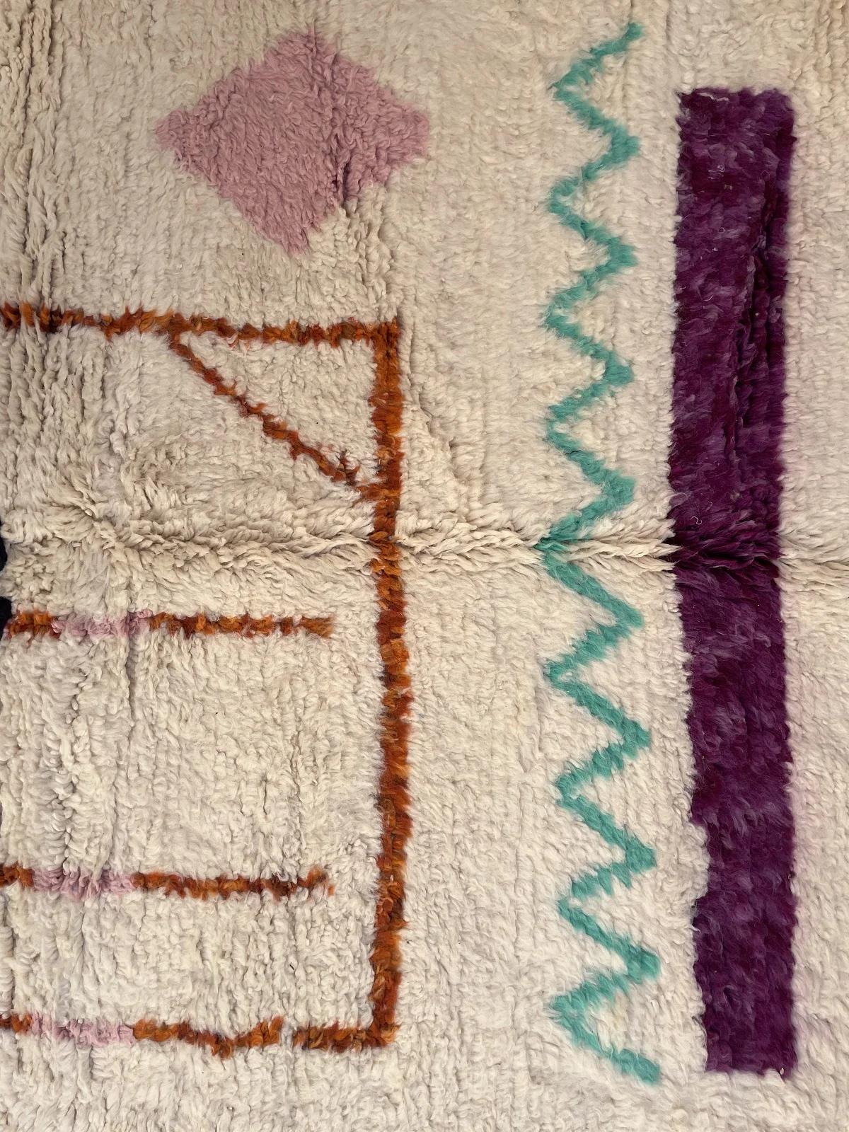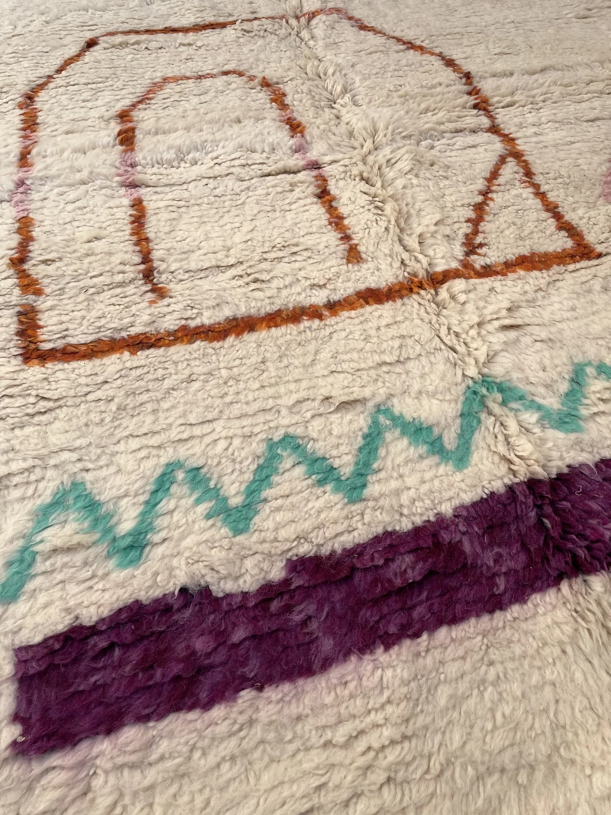 Named ‘Tiqqi,’ meaning ‘expression’ or ‘countenance,’ this Beni Ourain rug is a truly captivating piece of modern folk art. Upon its plush, creamy wool base, bold, simplified shapes in deep purple, rust orange, and soft pink create an abstract visage or figure. A striking turquoise zigzag and a single, expressive eye add a touch of whimsy and unexpected color. This rug pushes the boundaries of traditional Beni Ourain design, offering a unique, artistic statement that is both playful and profoundly original.