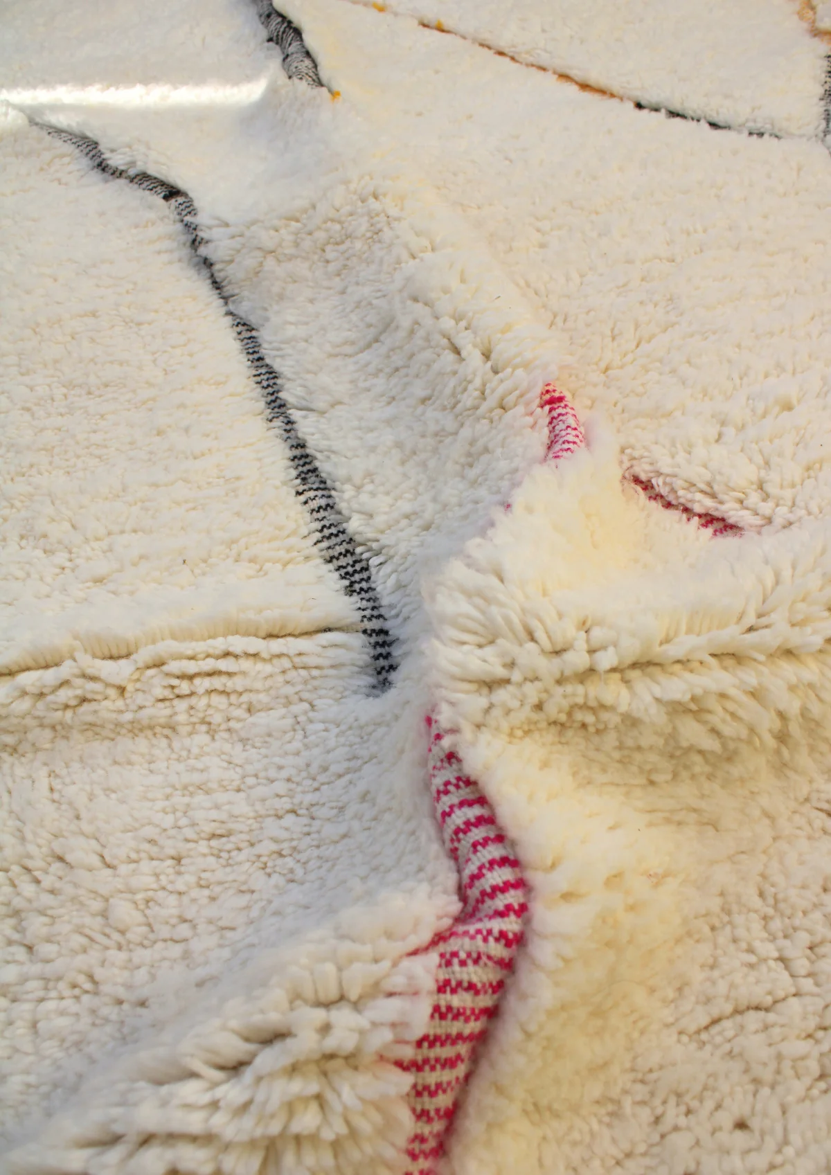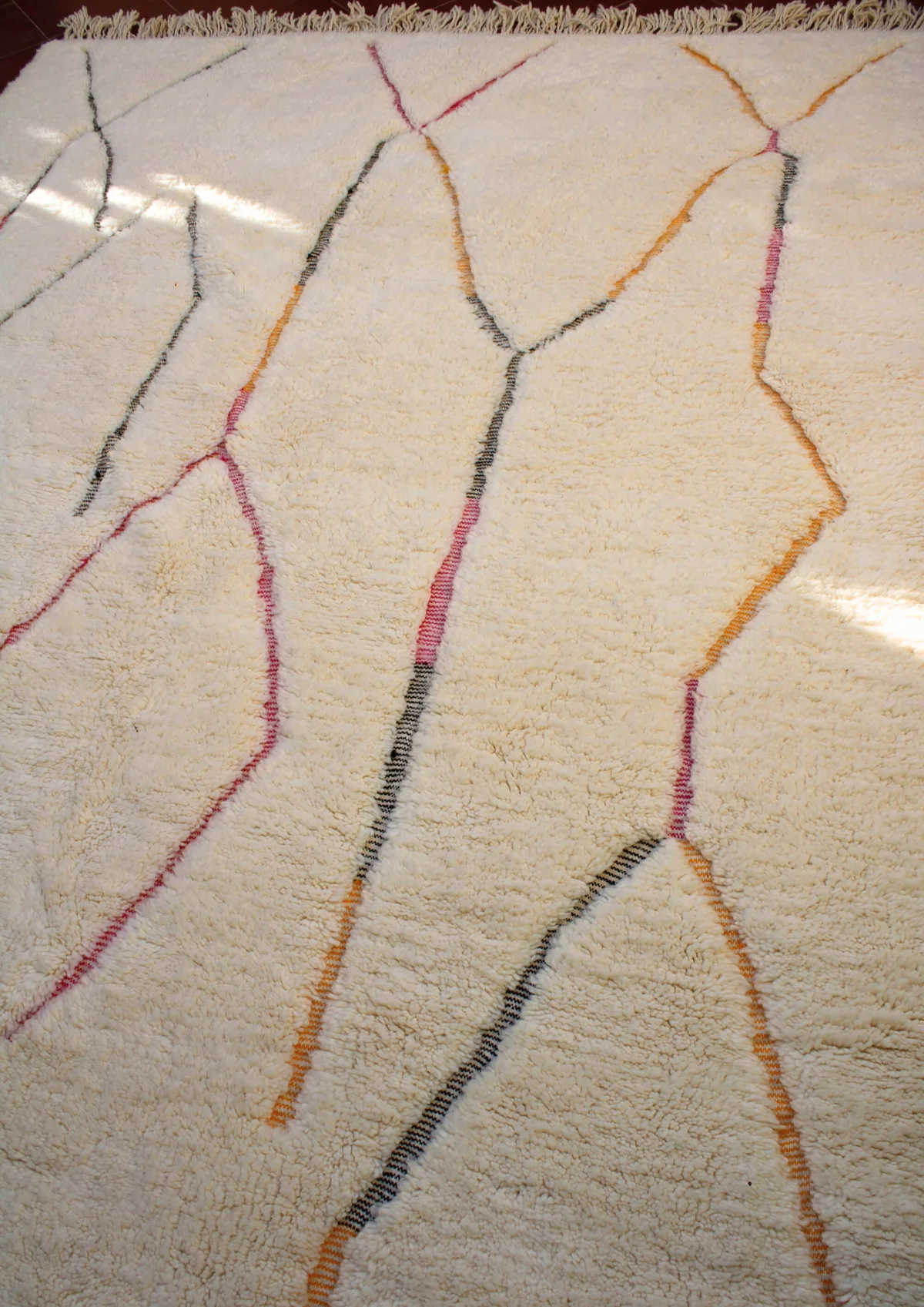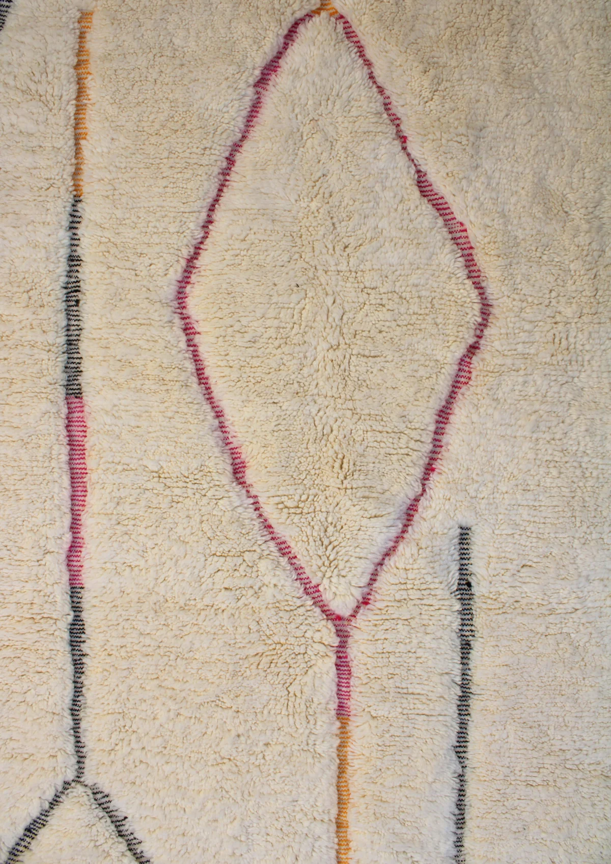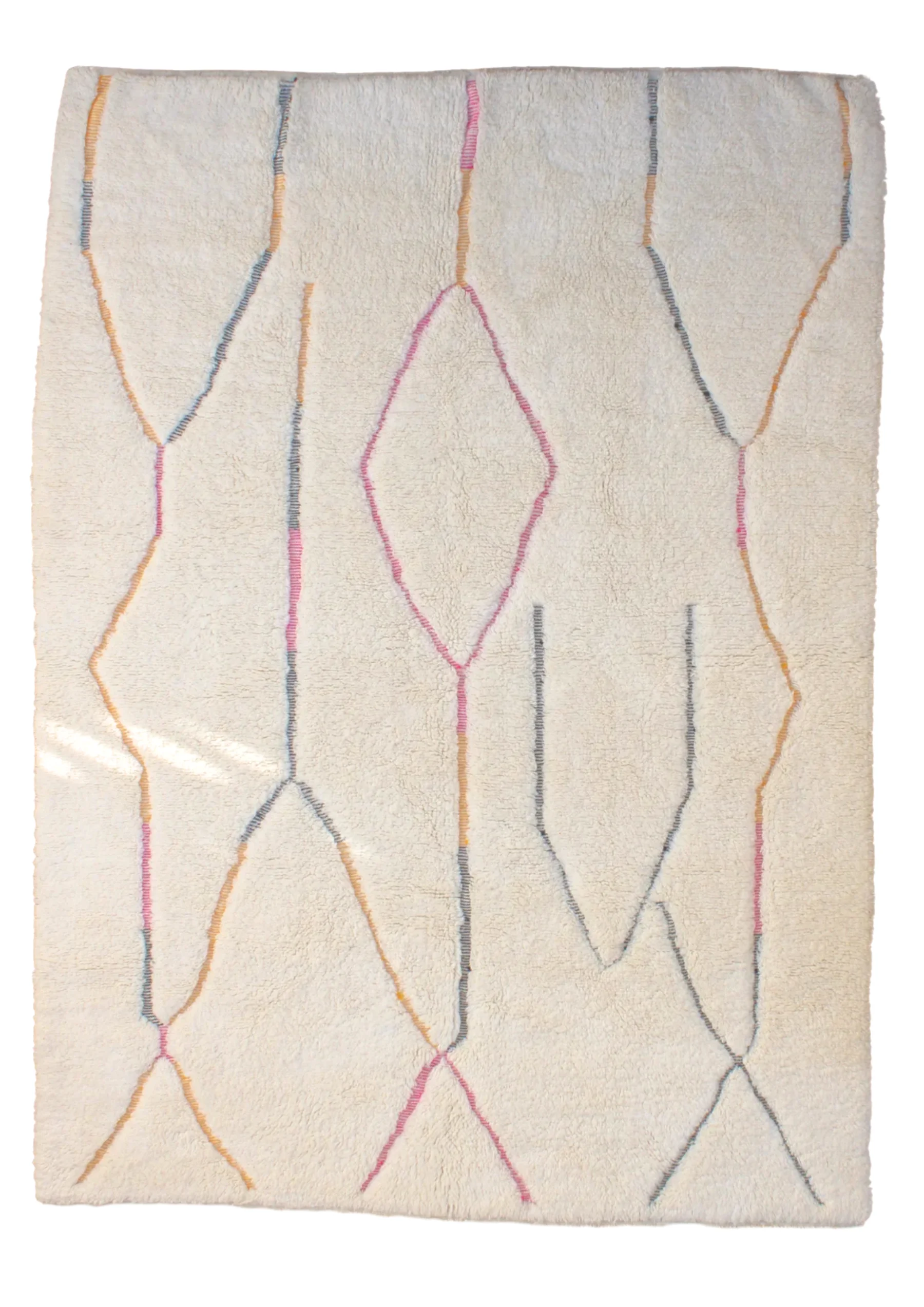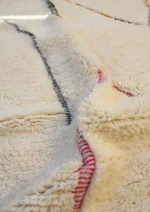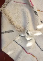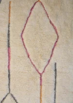 Named ‘Tirga,’ meaning ‘dreams’ in Amazigh, this Beni Ourain rug is a captivating piece where minimalist elegance meets subtle artistry. Across its plush, creamy wool surface, delicate, meandering lines in soft pink, sun-kissed orange, and cool gray-blue wander freely, occasionally forming an open diamond or playful zigzags. This design offers a profound sense of calm and introspection, bringing a dreamlike serenity and understated sophistication to any contemporary or bohemian space.