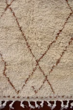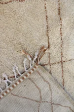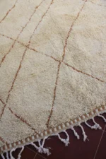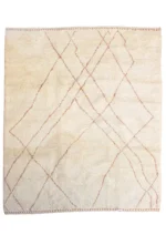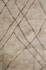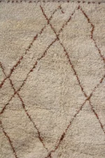Named ‘Asfar,’ meaning ‘light’ or ‘dawn’ in Amazigh, this Beni Ourain rug presents a beautifully soft interpretation of the iconic diamond pattern. Across its plush, creamy wool surface, delicate lines in a subtle light brown trace a geometric dance, as if gently etched onto the fabric. This piece embodies an understated elegance, offering the luxurious comfort of traditional Beni Ourain weaving with a lighter, almost ethereal design that brings serenity and warmth to any space.