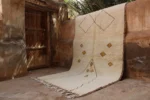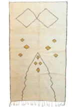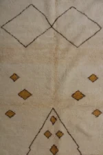 Named ‘Tighremt,’ after the fortified homes nestled in the Atlas Mountains, this Beni Ourain rug is a tribute to the enduring strength of the landscape. Upon its plush, creamy wool surface, bold, intersecting lines in deep natural brown form large, protective diamonds. Zigzag patterns, reminiscent of mountain paths, add dynamic energy. Small, golden yellow diamonds are scattered like treasures, infusing the minimalist design with subtle warmth. This piece embodies the grounded elegance and serene comfort that defines authentic Beni Ourain weaving.