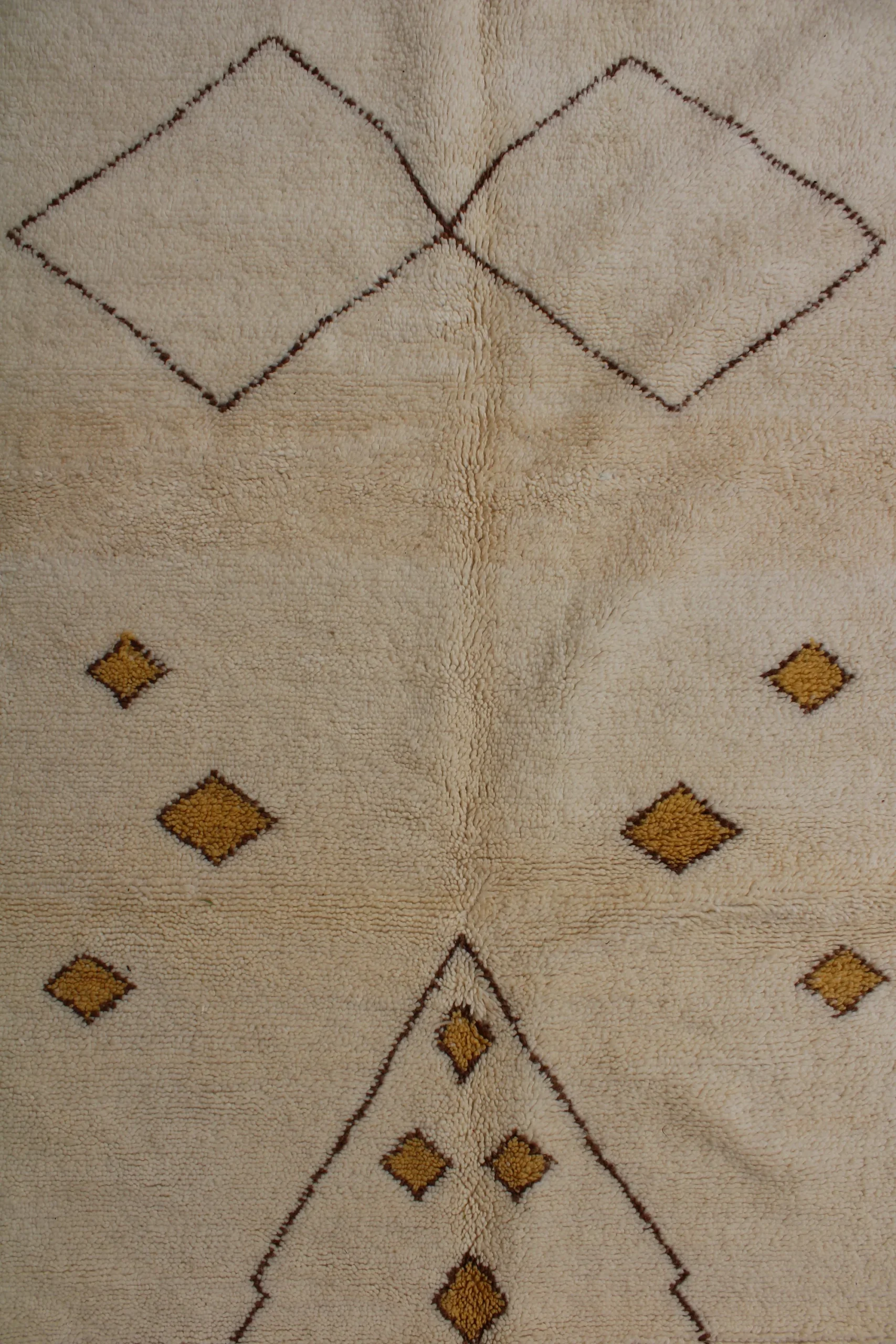 Echoing the strength of the Atlas Mountains, this Beni Ourain rug features bold brown lines and golden diamonds on plush ivory, bringing grounded elegance and serene comfort.