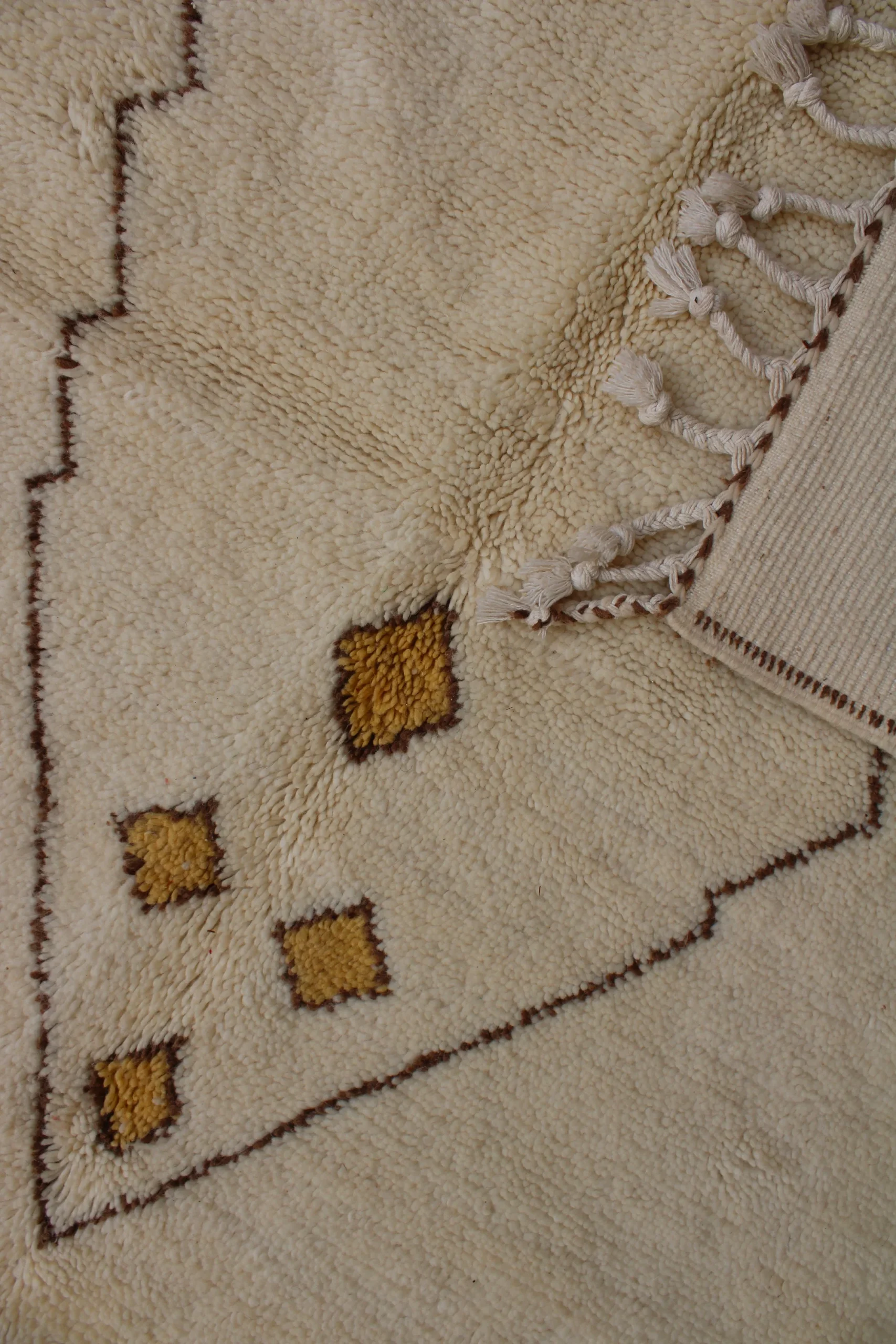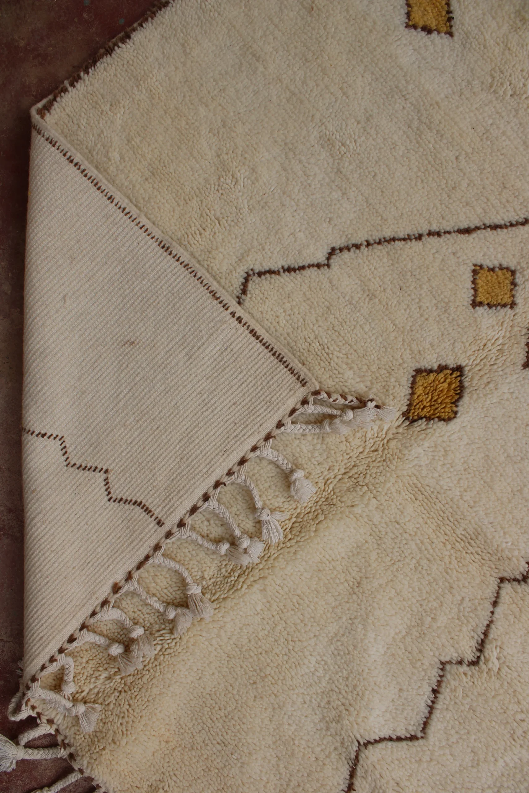 Named ‘Tighremt,’ after the fortified homes nestled in the Atlas Mountains, this Beni Ourain rug is a tribute to the enduring strength of the landscape. Upon its plush, creamy wool surface, bold, intersecting lines in deep natural brown form large, protective diamonds. Zigzag patterns, reminiscent of mountain paths, add dynamic energy. Small, golden yellow diamonds are scattered like treasures, infusing the minimalist design with subtle warmth. This piece embodies the grounded elegance and serene comfort that defines authentic Beni Ourain weaving.