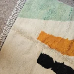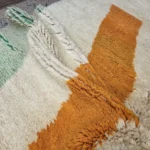 A Beni Ourain rug named ‘Timad’ (Forms), this piece is a captivating canvas of bold, abstract shapes in orange, black, and mint green on plush wool, a unique artistic statement.
