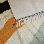 Named ‘Timad,’ meaning ‘forms’ or ‘shapes’ in Amazigh, this Beni Ourain rug is a captivating work of abstract art. Its plush, creamy wool surface serves as a canvas for bold, expressive blocks of color: a striking vertical stripe of fiery orange, a powerful contrasting black form, and a fresh triangular sweep of mint green. These irregular, organic shapes challenge traditional patterns, creating a dynamic and distinctly modern composition. This piece offers the renowned luxurious comfort of an authentic Beni Ourain, while making a truly unique artistic statement in any contemporary space.
