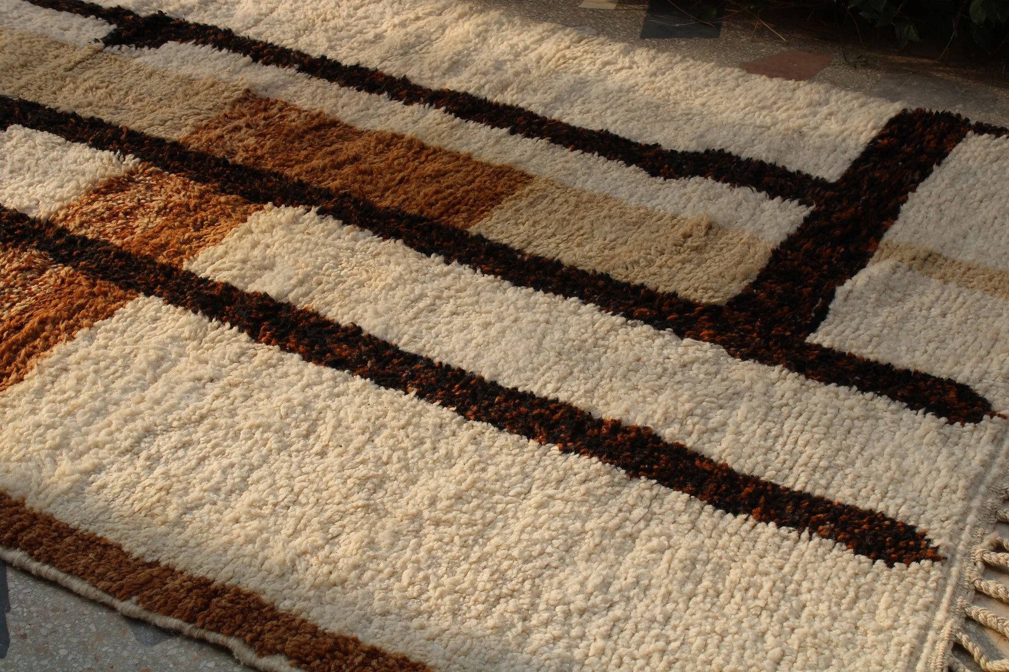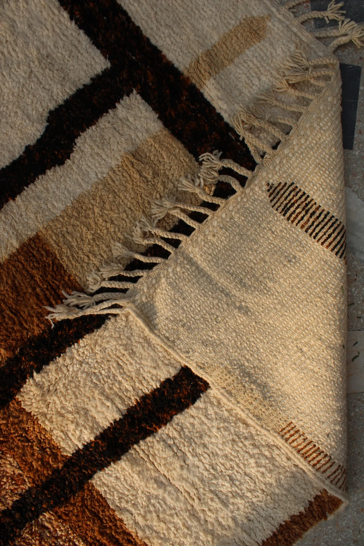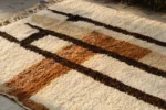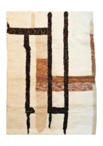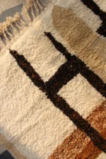 Named ‘Tijji,’ meaning ‘structure’ or ‘building’ in Amazigh, this Beni Ourain rug is a captivating work of minimalist abstraction. Its plush, creamy wool surface serves as a canvas for bold, thick lines in contrasting black and warm natural brown, forming a powerful, architectural composition of intersecting verticals and horizontals. Subtle variations in hue and texture within the beige field add depth. This piece offers the renowned luxurious comfort of an authentic Beni Ourain, while making a commanding, contemporary statement that feels both grounded and profoundly modern for any space.