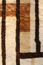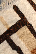 A Beni Ourain rug named ‘Tijji’ (Structure), this piece is a captivating canvas of bold, architectural lines in black and warm brown on plush ivory, a truly modern artistic statement.