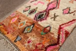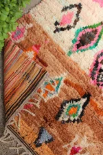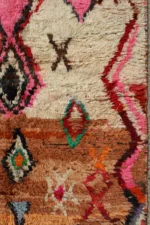 Named ‘Tazeqqa,’ meaning ‘red’ or ‘warmth’ in Amazigh, this Boujad rug is a canvas alive with fiery passion and boundless expression. Its dominant red field is punctuated by a bold, central pink and black diamond, a powerful heart of the design. Horizontal bands of warm brown anchor the composition, while a lively scattering of smaller diamonds and abstract symbols in vibrant green, orange, and blue fill the space with dynamic energy. This piece is a true mosaic of the weaver’s soul, bringing intense warmth and a captivating story into your home.
