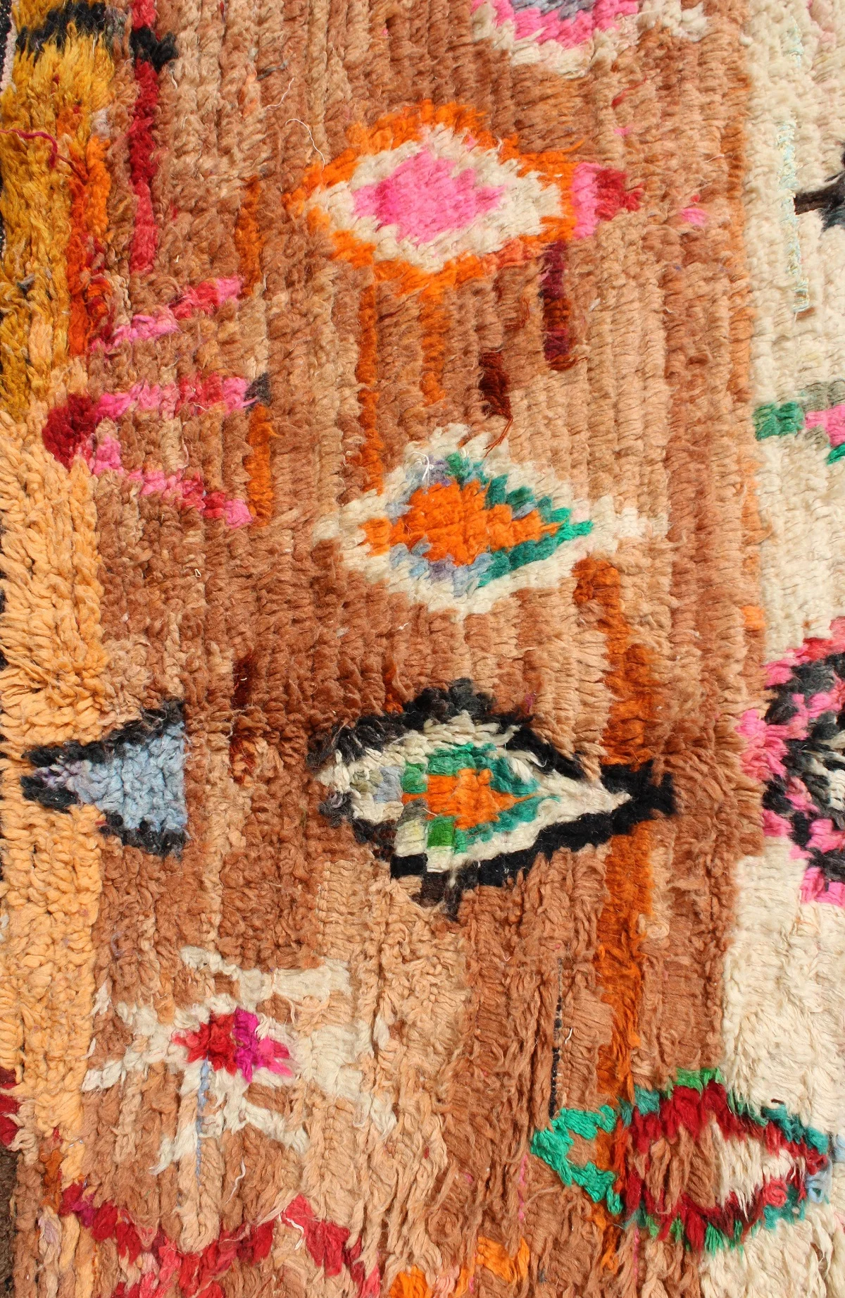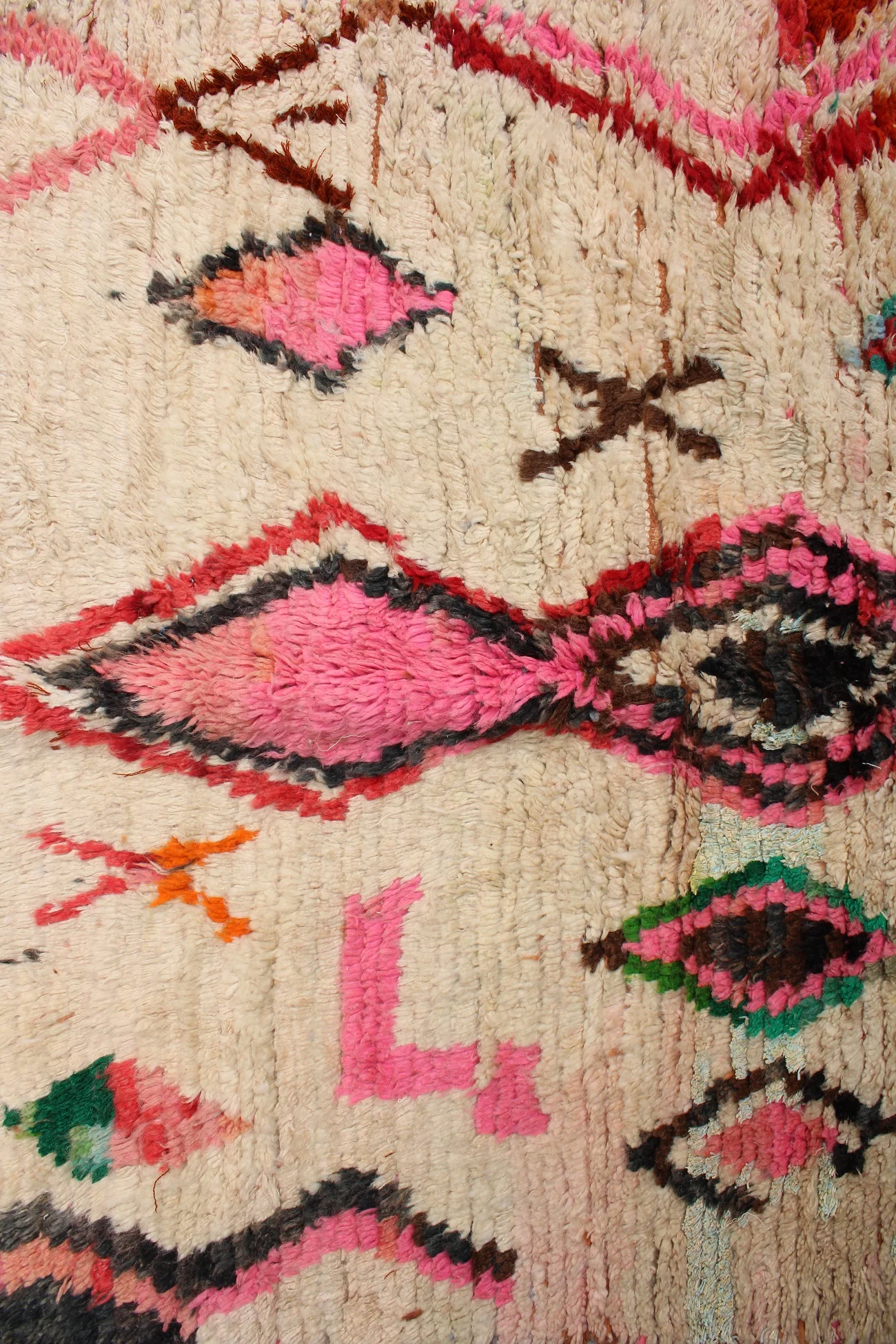Named ‘Tazeqqa,’ meaning ‘red’ or ‘warmth’ in Amazigh, this Boujad rug is a canvas alive with fiery passion and boundless expression. Its dominant red field is punctuated by a bold, central pink and black diamond, a powerful heart of the design. Horizontal bands of warm brown anchor the composition, while a lively scattering of smaller diamonds and abstract symbols in vibrant green, orange, and blue fill the space with dynamic energy. This piece is a true mosaic of the weaver’s soul, bringing intense warmth and a captivating story into your home.