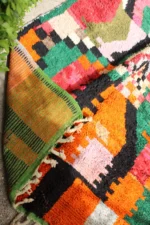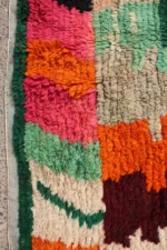 Named ‘Tamghra,’ meaning ‘celebration’ or ‘festivity’ in Amazigh, this Boujad rug is a truly spectacular and riotous expression of unbound artistry. Its surface is a dynamic mosaic of bold, irregular blocks in a vivid kaleidoscope of orange, pink, deep green, and earthy brown. A striking central arch-like motif, bursting with color, anchors the design amidst a joyful scattering of abstract shapes and lines. This piece embodies the raw, uninhibited creativity of the Boujad weaver, bringing an intense burst of warmth, character, and undeniable artistic presence to any space.