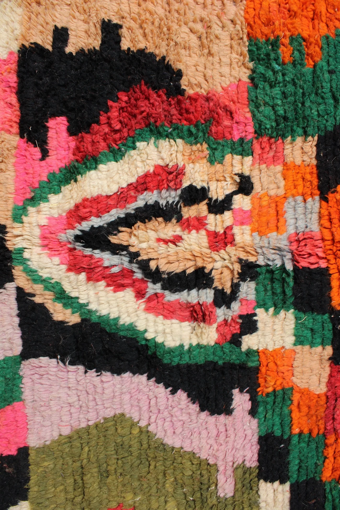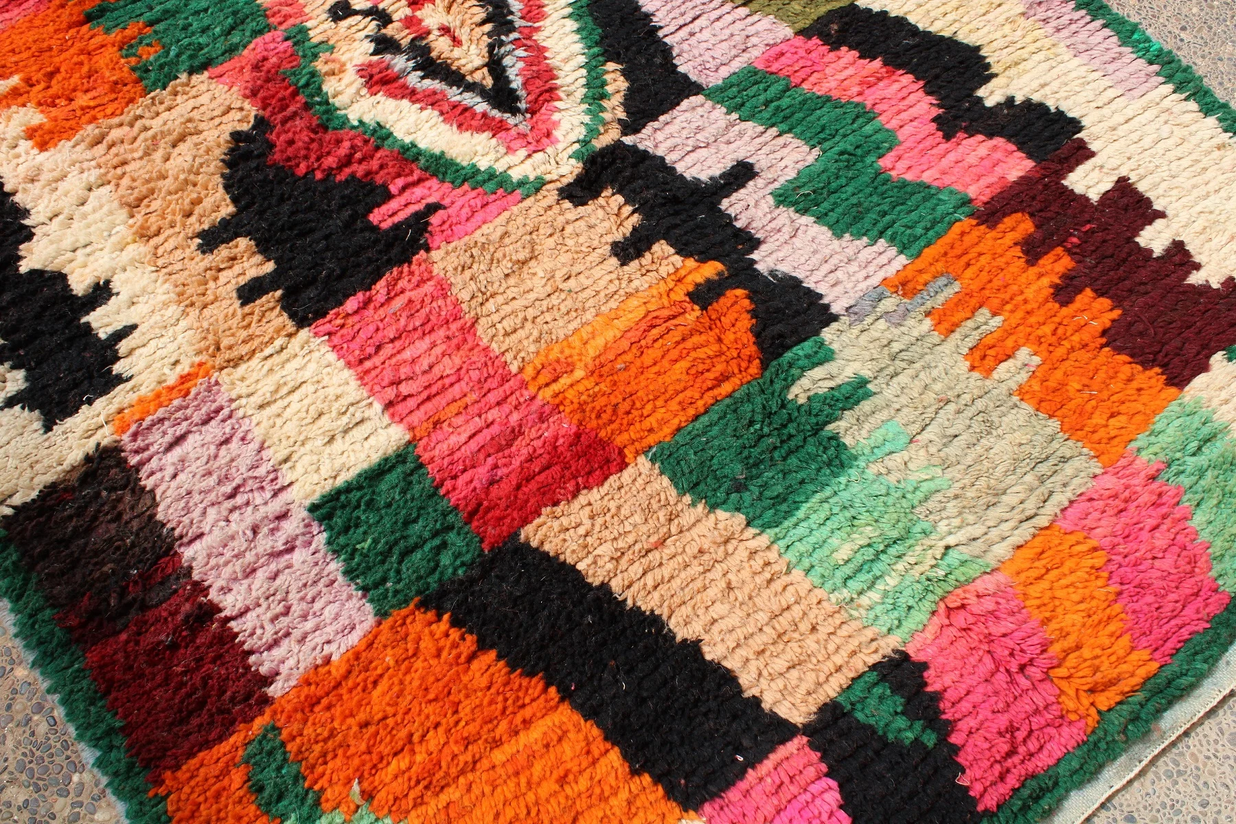 Named ‘Tamghra,’ meaning ‘celebration’ or ‘festivity’ in Amazigh, this Boujad rug is a truly spectacular and riotous expression of unbound artistry. Its surface is a dynamic mosaic of bold, irregular blocks in a vivid kaleidoscope of orange, pink, deep green, and earthy brown. A striking central arch-like motif, bursting with color, anchors the design amidst a joyful scattering of abstract shapes and lines. This piece embodies the raw, uninhibited creativity of the Boujad weaver, bringing an intense burst of warmth, character, and undeniable artistic presence to any space.