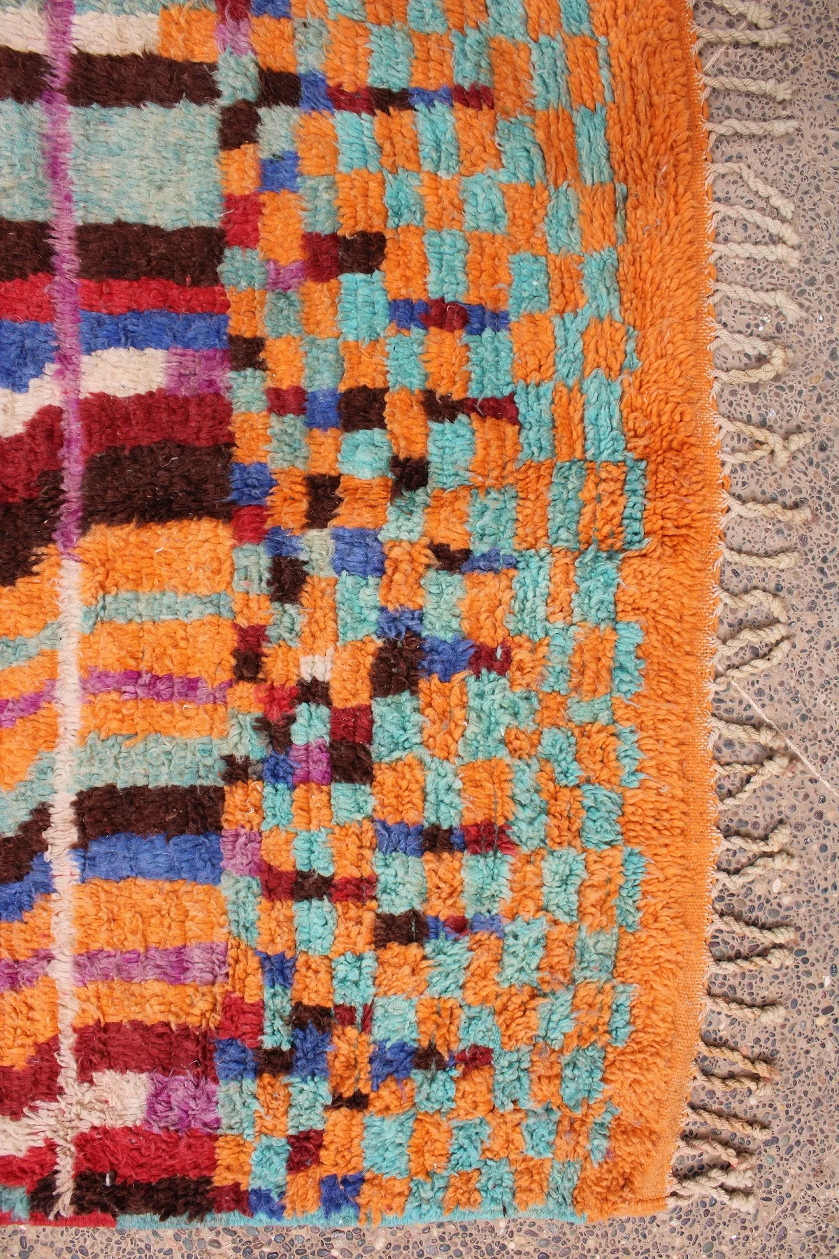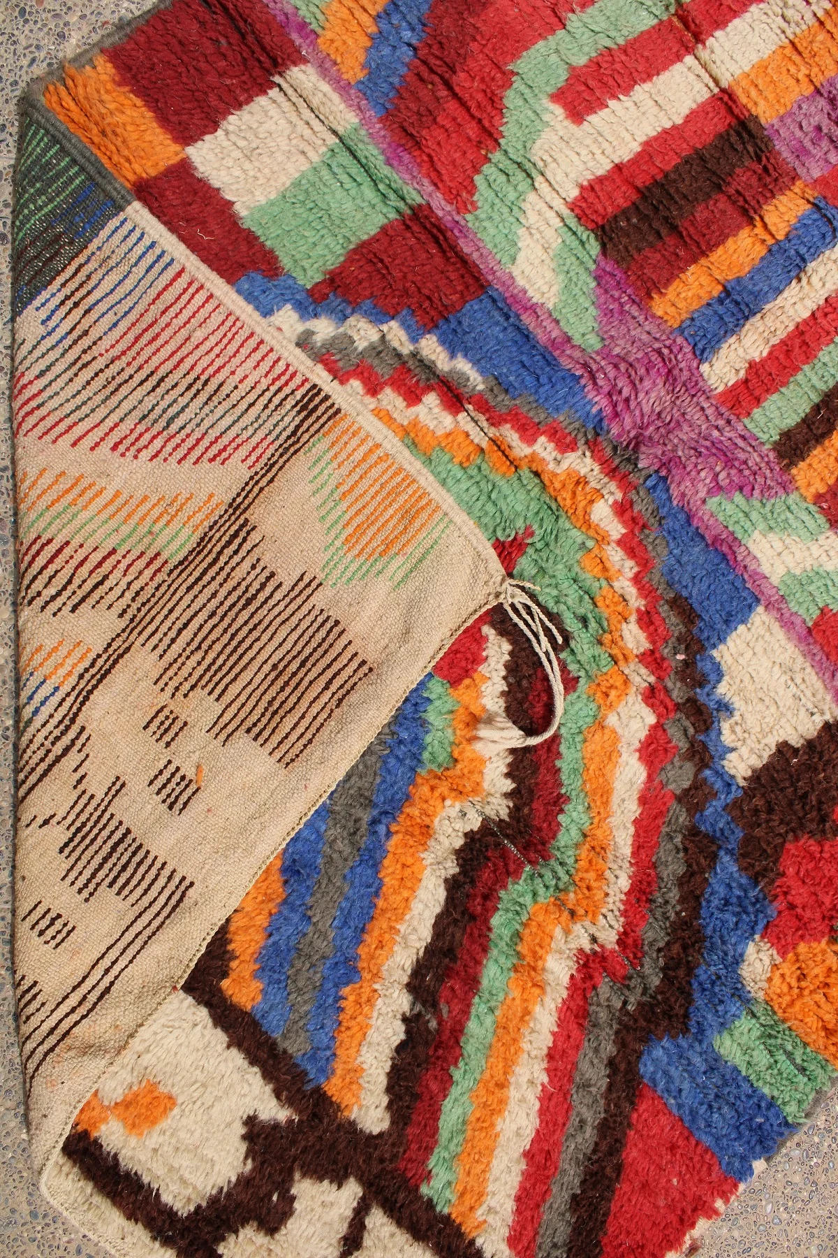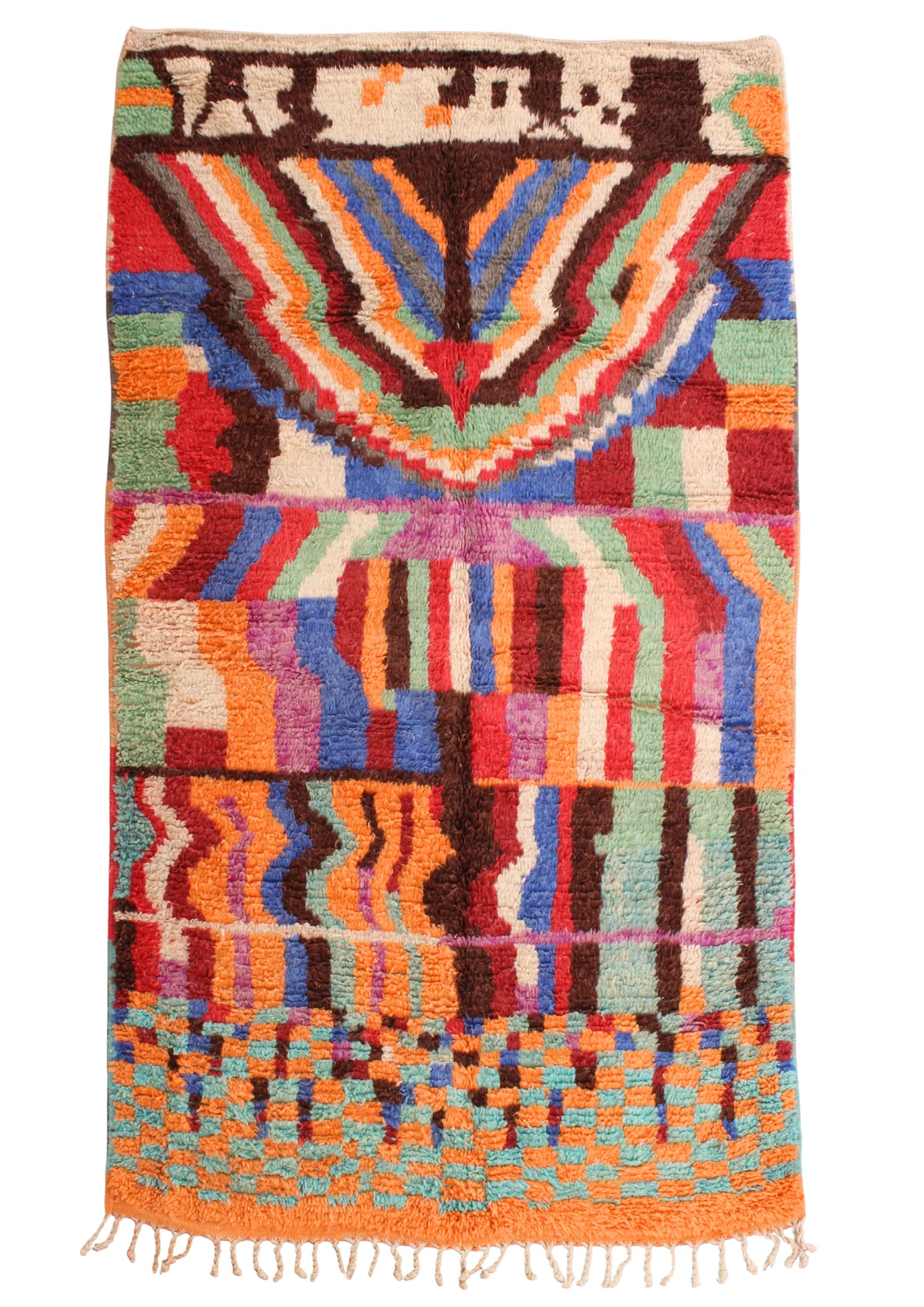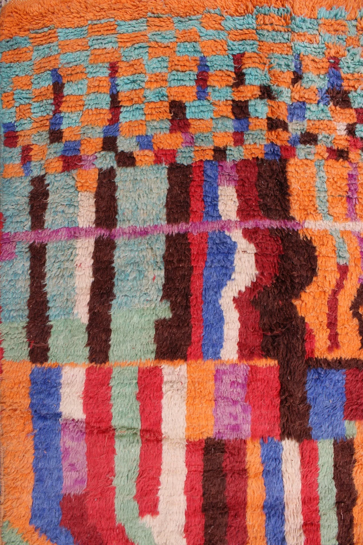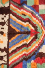 Named ‘Tili,’ meaning ‘color’ or ‘dye’ in Amazigh, this Boujad rug is a dazzling celebration of vibrant hues and fearless artistry. Its surface is a dynamic mosaic of rich reds, fiery oranges, and deep blues, interspersed with emerald green, bold pink, and soft purple. A prominent, wing-like motif crowns the top, while irregular blocks and playful patterns unfold across the rug, revealing the weaver’s uninhibited creativity. This piece embodies the raw, expressive soul of the Boujad tradition, bringing an intense burst of warmth, character, and undeniable artistic presence to any space.