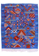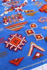 Named ‘Tabruri,’ meaning ‘tapestry’ in Amazigh, this Taznakht rug is a breathtaking visual encyclopedia of cultural symbols. Its vibrant blue field is a lively backdrop for a rich, dense array of ancient Amazigh motifs in fiery oranges, deep reds, crisp whites, and earthy browns. Each intricate diamond, zigzag, cross, and abstract figure tells a story, revealing generations of wisdom and belief. Woven with a sophisticated mixed technique of flatweave and raised pile, this rug is a testament to the artisan’s profound knowledge and skill, bringing a vibrant piece of Moroccan soul into your space.