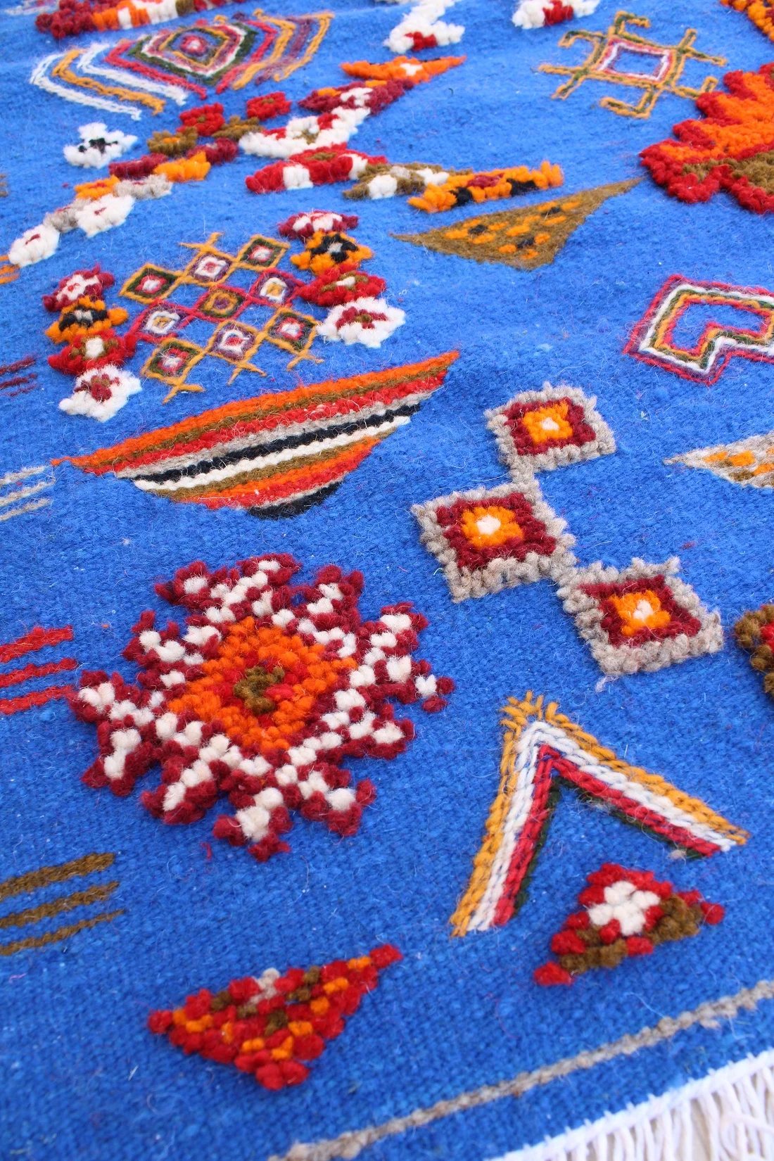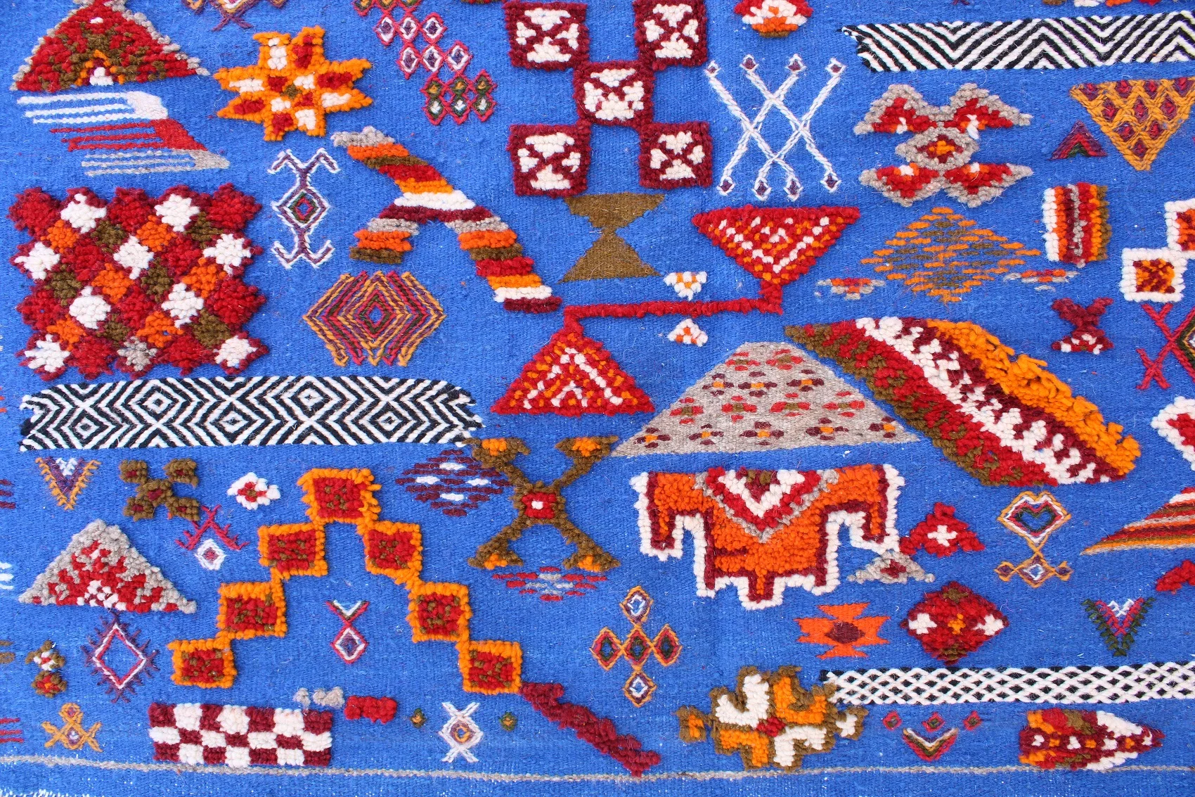 A breathtaking visual encyclopedia of Amazigh symbols woven on a vibrant blue field, this Taznakht tapestry tells generations of profound cultural stories.