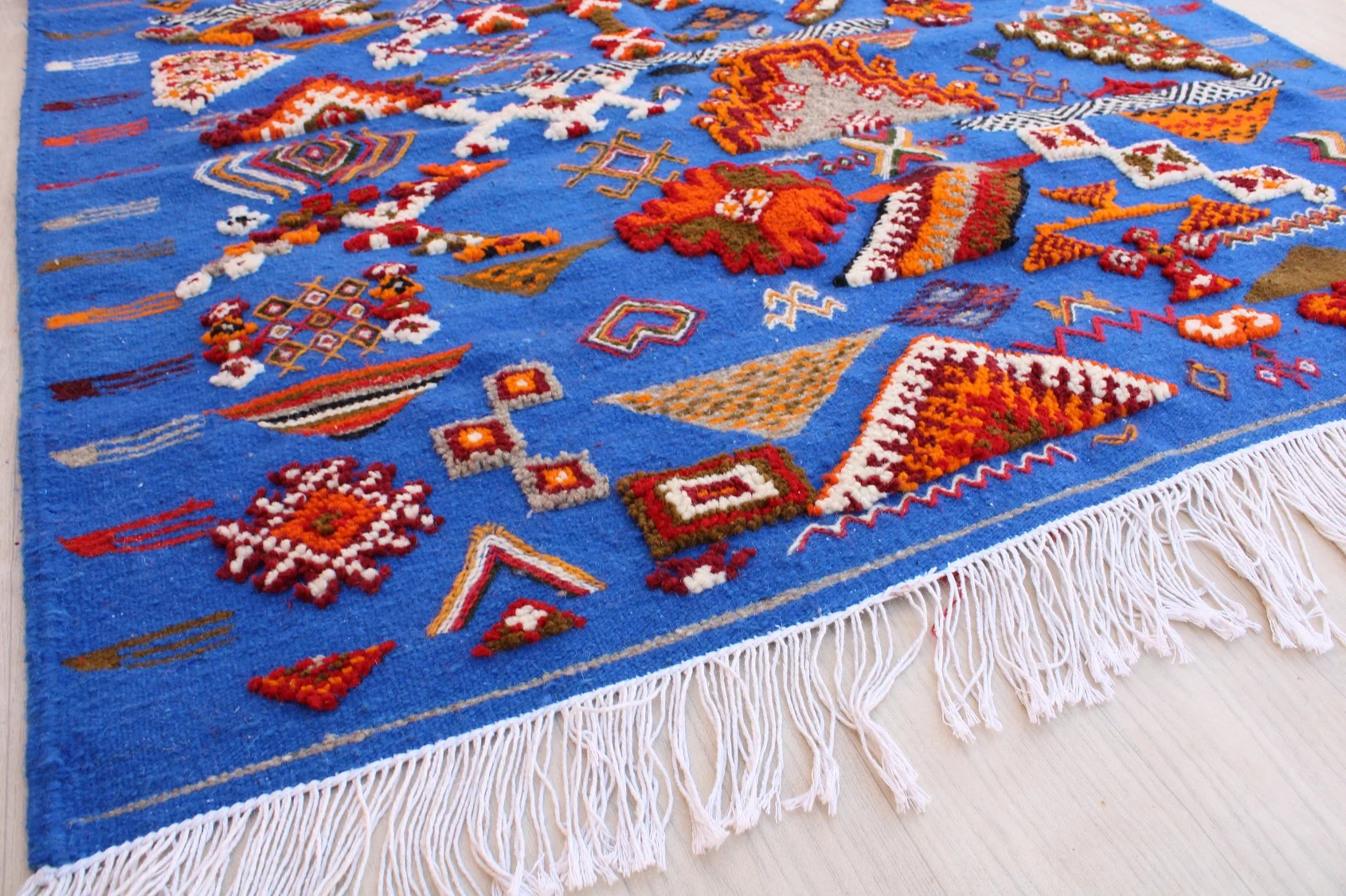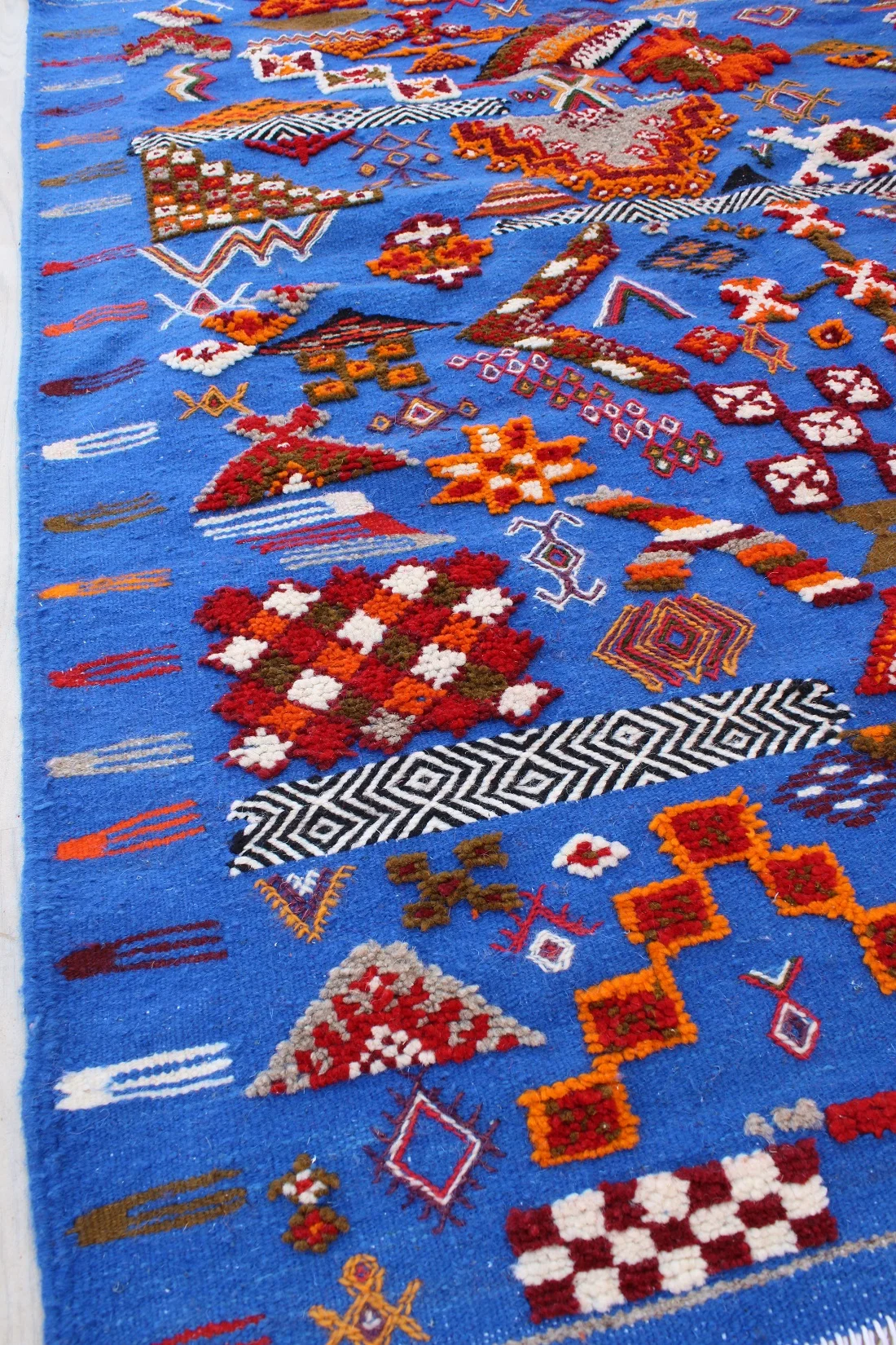 Named ‘Tabruri,’ meaning ‘tapestry’ in Amazigh, this Taznakht rug is a breathtaking visual encyclopedia of cultural symbols. Its vibrant blue field is a lively backdrop for a rich, dense array of ancient Amazigh motifs in fiery oranges, deep reds, crisp whites, and earthy browns. Each intricate diamond, zigzag, cross, and abstract figure tells a story, revealing generations of wisdom and belief. Woven with a sophisticated mixed technique of flatweave and raised pile, this rug is a testament to the artisan’s profound knowledge and skill, bringing a vibrant piece of Moroccan soul into your space.
