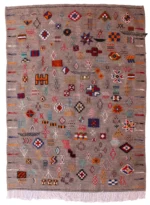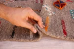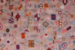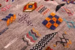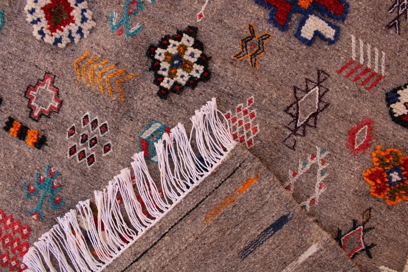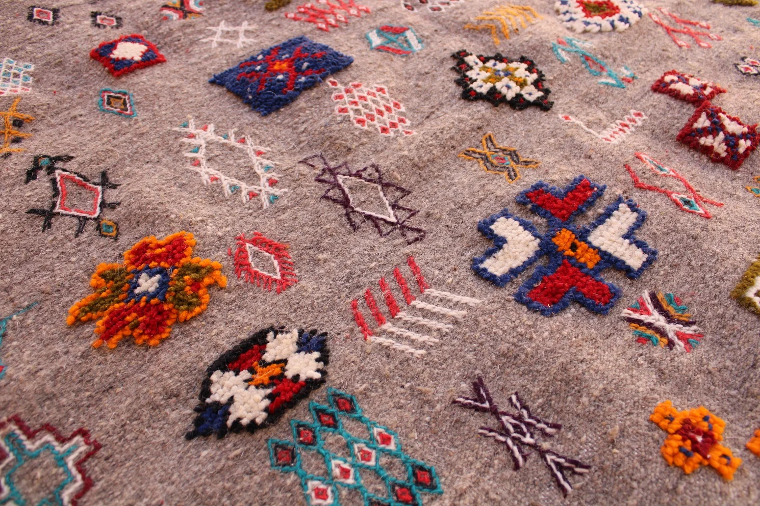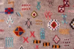 Named ‘Tafsut,’ meaning ‘spring’ in Amazigh, this Taznakht rug is a fresh and vibrant tapestry of ancient symbols. Against a sophisticated field of heather gray, a constellation of intricate Amazigh motifsāincluding diamonds, crosses, zigzags, and abstract figuresāare meticulously woven in a vivid spectrum of blues, reds, yellows, and oranges. Every motif, some subtly integrated, others boldly colorful, tells a piece of a larger story, from protection to natural beauty. This piece is a testament to the artisan’s profound knowledge and skill, bringing a nuanced beauty and deep cultural story into your home.