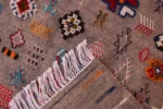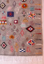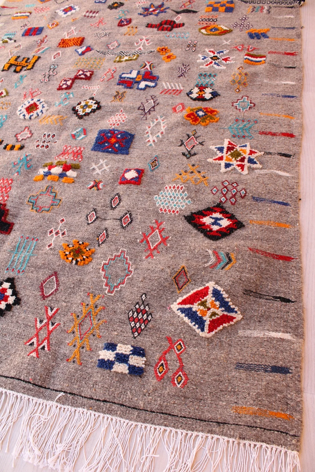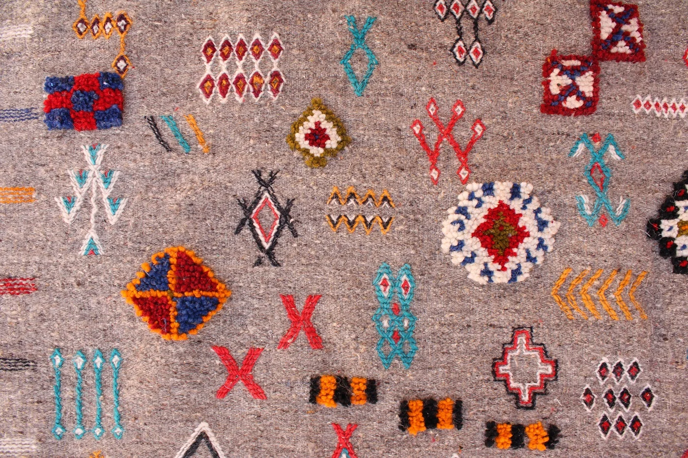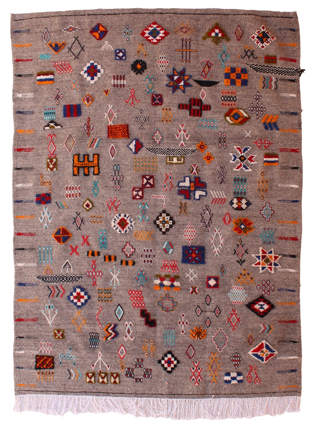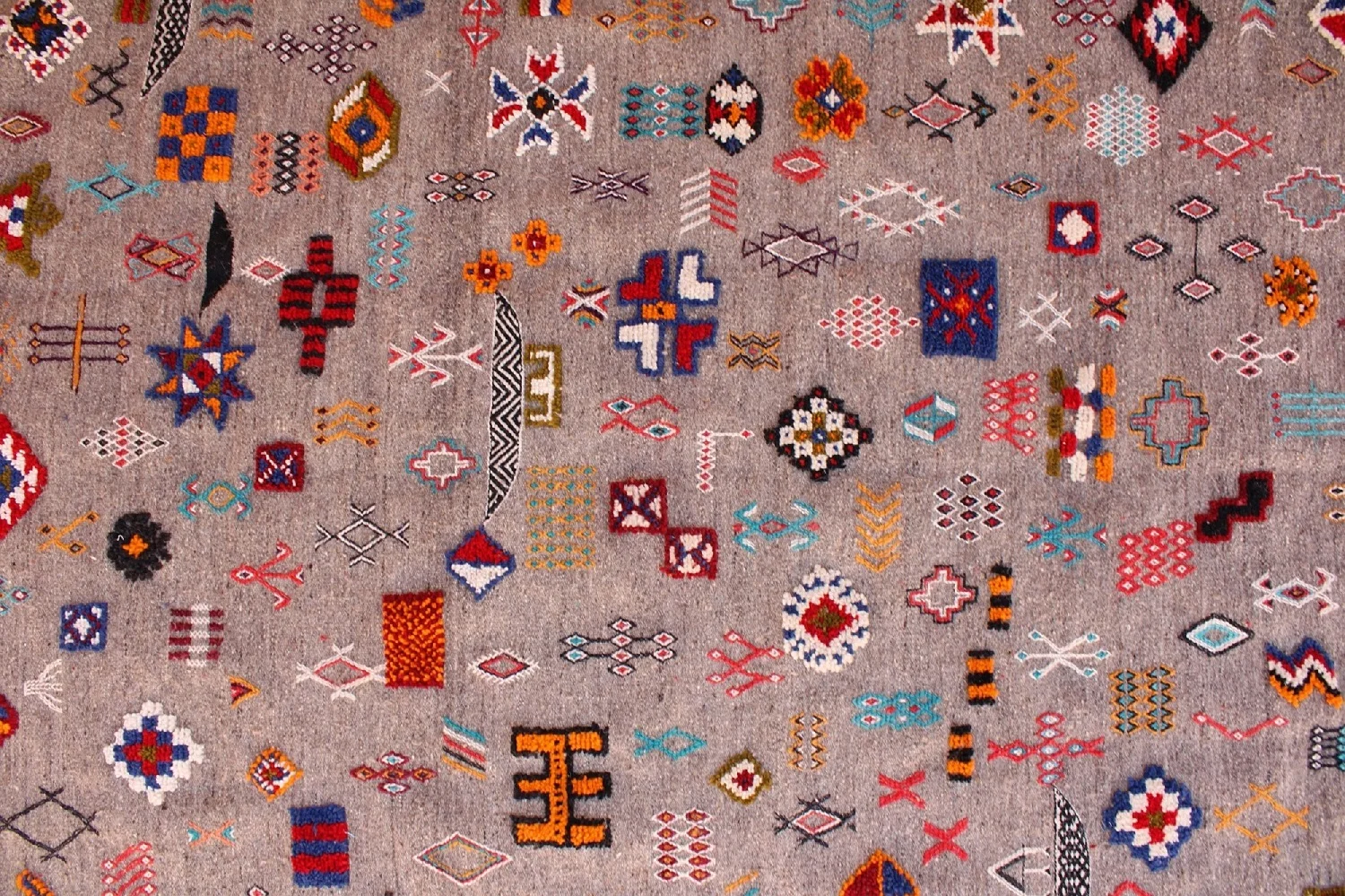 A sophisticated Taznakht rug on heather gray, ‘Tafsut’ is a vibrant constellation of intricate Amazigh symbols, each a whisper of ancient wisdom.