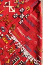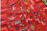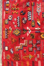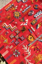 Named ‘Timlilit,’ meaning ‘gathering’ or ‘assembly’ in Amazigh, this Taznakht rug is a powerful and vibrant tapestry of cultural narratives. Its bold, fiery red field serves as a lively stage for a myriad of intricate Amazigh symbolsāincluding prominent ‘tree of life’ figures, geometric diamonds, crosses, and playful abstract shapes. Each meticulously woven motif, rendered in a kaleidoscope of blues, yellows, oranges, and greens, contributes to a rich visual language. This piece is a testament to generations of profound wisdom, bringing a dynamic and deeply meaningful story into your home.