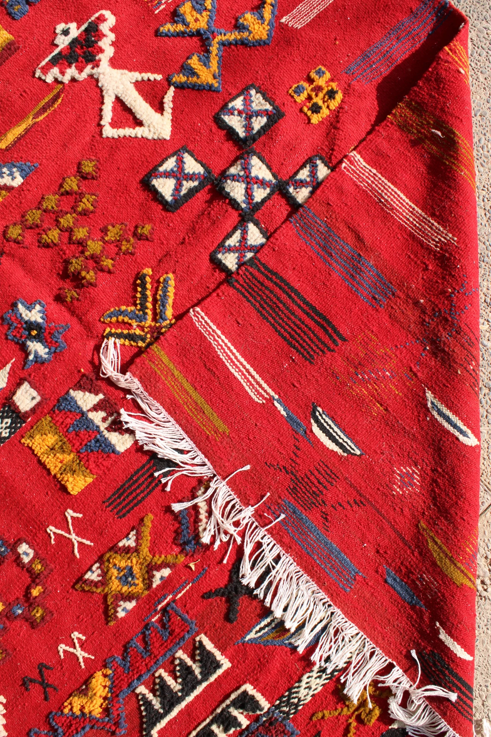 Named ‘Timlilit,’ meaning ‘gathering’ or ‘assembly’ in Amazigh, this Taznakht rug is a powerful and vibrant tapestry of cultural narratives. Its bold, fiery red field serves as a lively stage for a myriad of intricate Amazigh symbolsāincluding prominent ‘tree of life’ figures, geometric diamonds, crosses, and playful abstract shapes. Each meticulously woven motif, rendered in a kaleidoscope of blues, yellows, oranges, and greens, contributes to a rich visual language. This piece is a testament to generations of profound wisdom, bringing a dynamic and deeply meaningful story into your home.